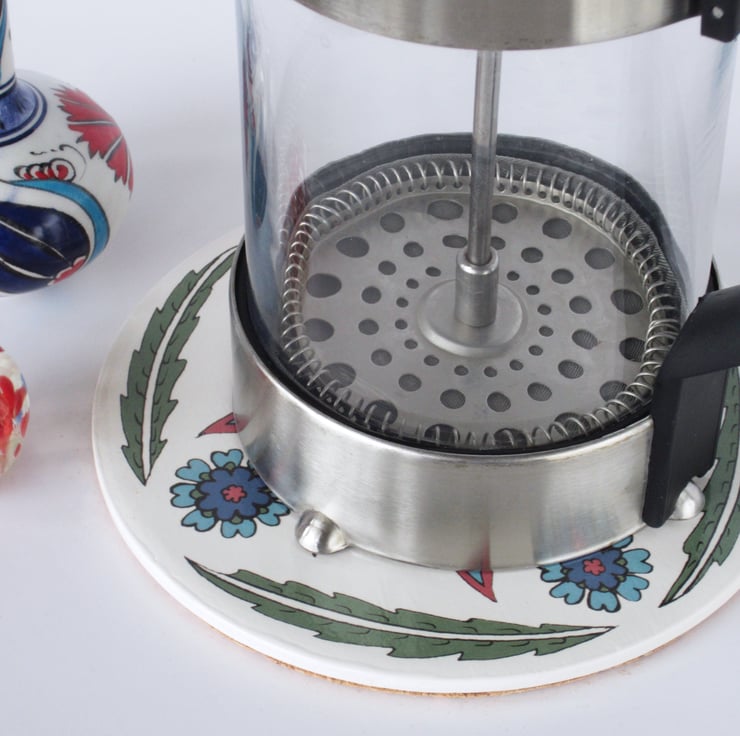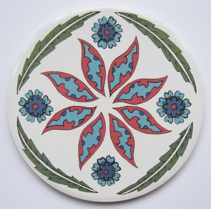 Ottoman Inspired Petal Pattern Round Ceramic Tile Trivet with Cork Backing from Jacqueline Talbot Designs