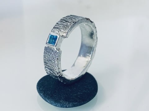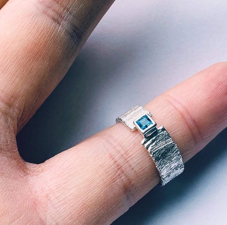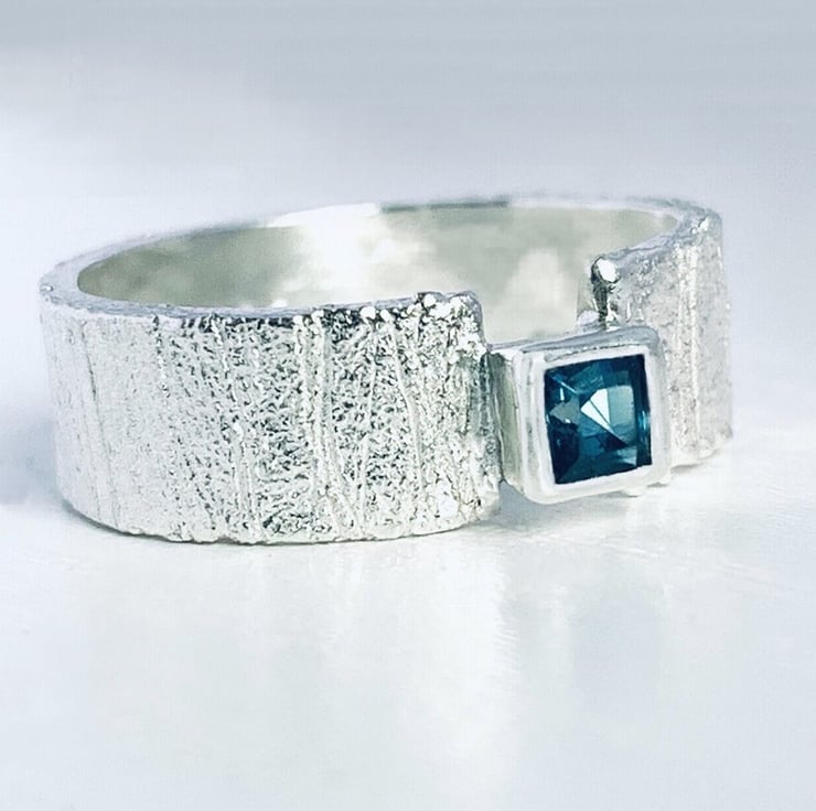 Handmade sterling silver ring, featuring a 3 mm square London blue topaz