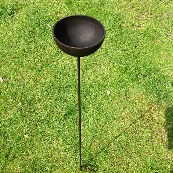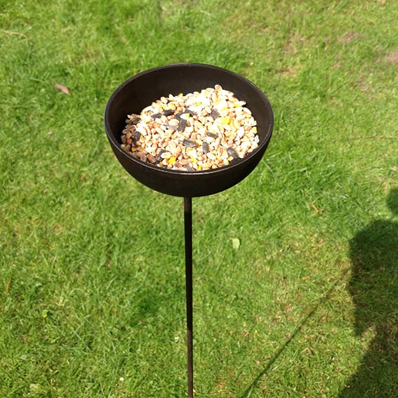110cm tall (approx), upright bird with 10cm feed bowl finished in rust resistant black or durable black coating. Hand made from sturdy steel. Includes drainage hole and pronged base to secure firmly in soil. Can be repositioned as required.
