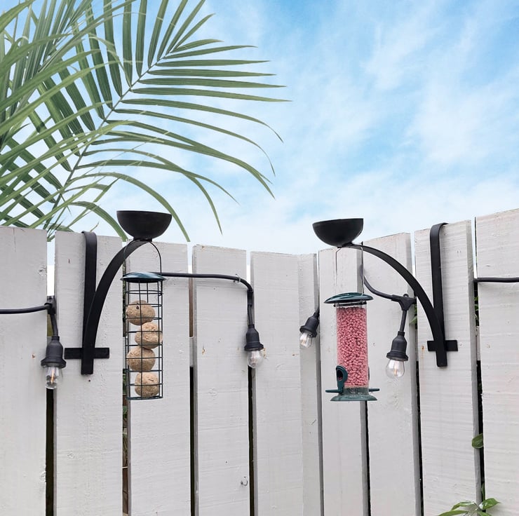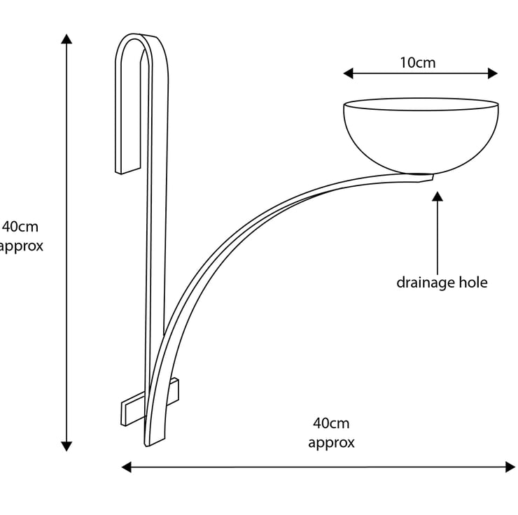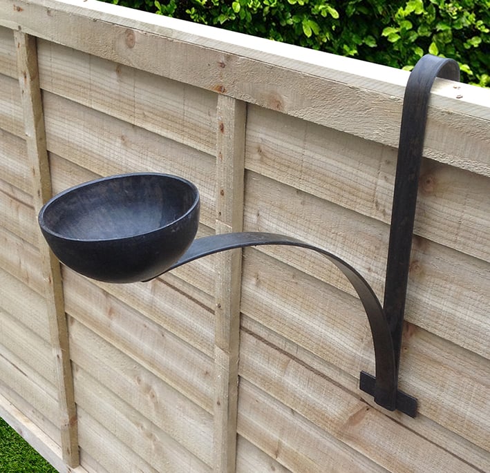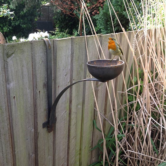 Handmade 'fence hanging' (position along fence, trellis etc) bird feeding bowl. Sculptured arched bird feeder with 10cm bowl, the feeder is the same size as a hanging basket bracket. Includes drainage hole. Made of mild steel and finished in rust resistant black. Seed (pic 1), hanging feeders (pic 4) not included.