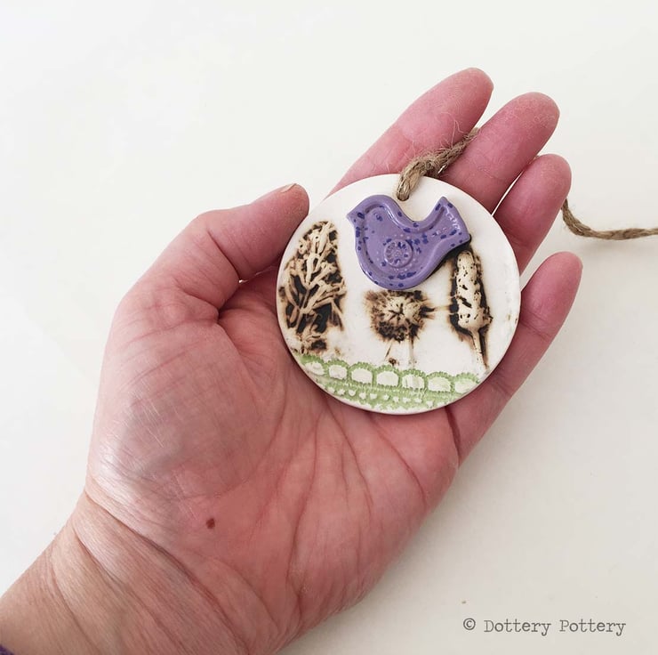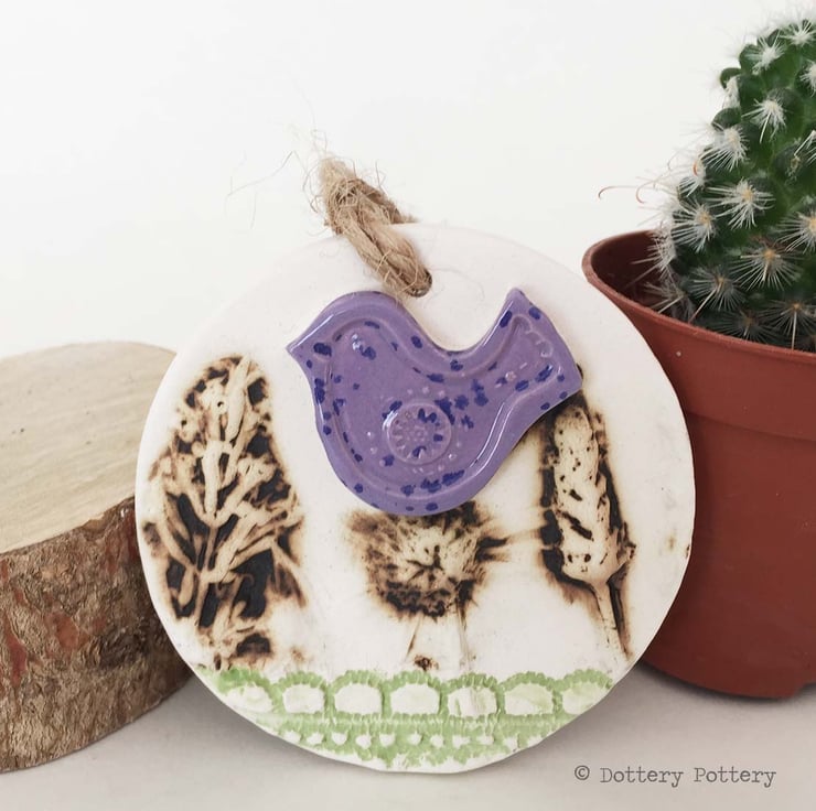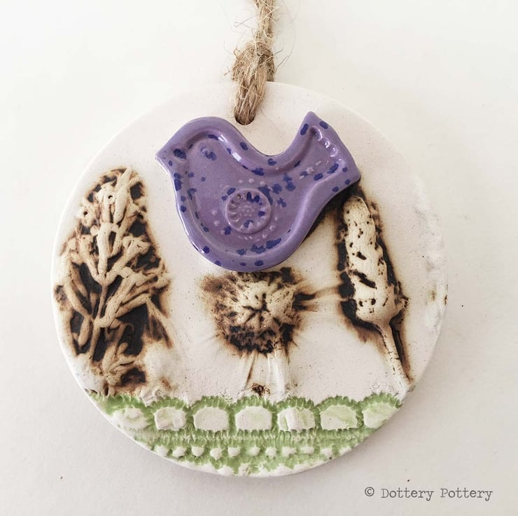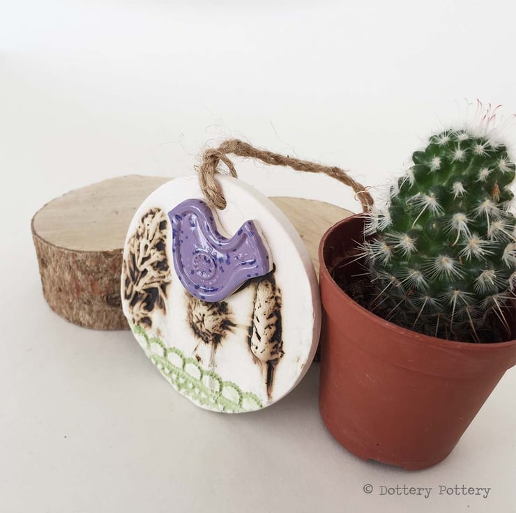 This cute little hanging decoration has been made from white earthenware clay where it has been decorated with a flower design and then fired twice.
