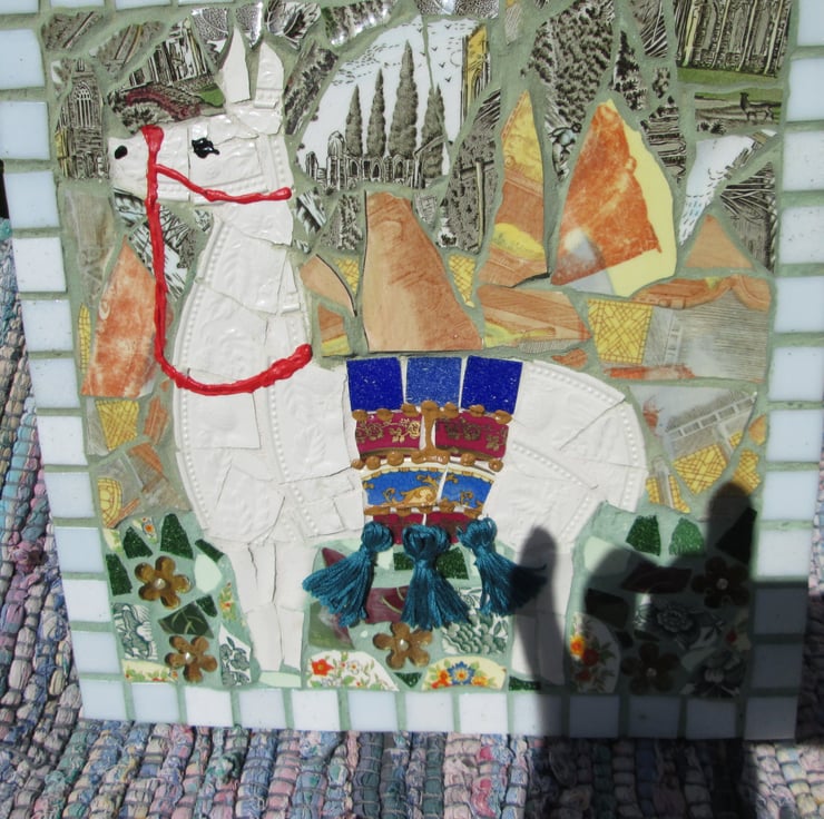 This mosaic Llama is made from various bits of Vintage Pottery, it is 25cm x 25cm in size and has a hanging attachment on the back.
