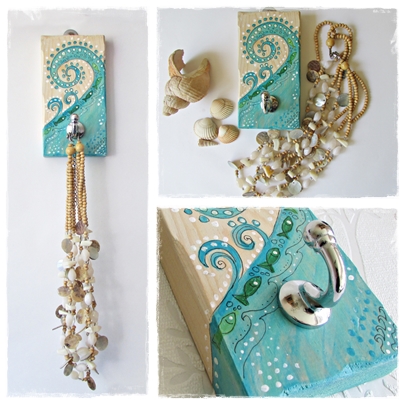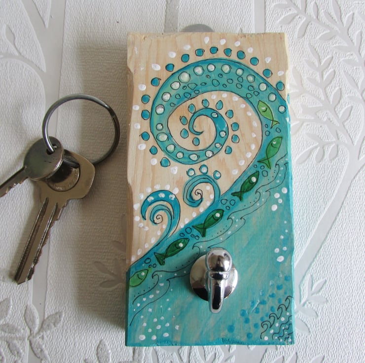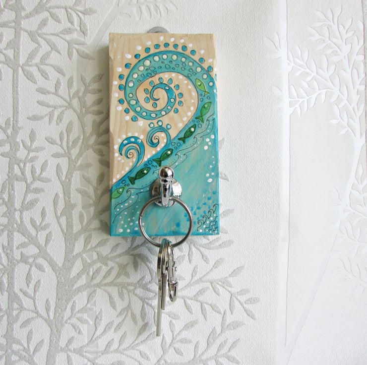 A pretty key hook to keep your keys in a safe place, no need to loose your keys around the house, keep them safe on this handpainted wooden key plaque. Painted in acrylic paints and varnished this simple design of a blue wave and fishes would look great hanging in your home. It would make a lovely gift for anyone, especially for an Aquarius birthdate.