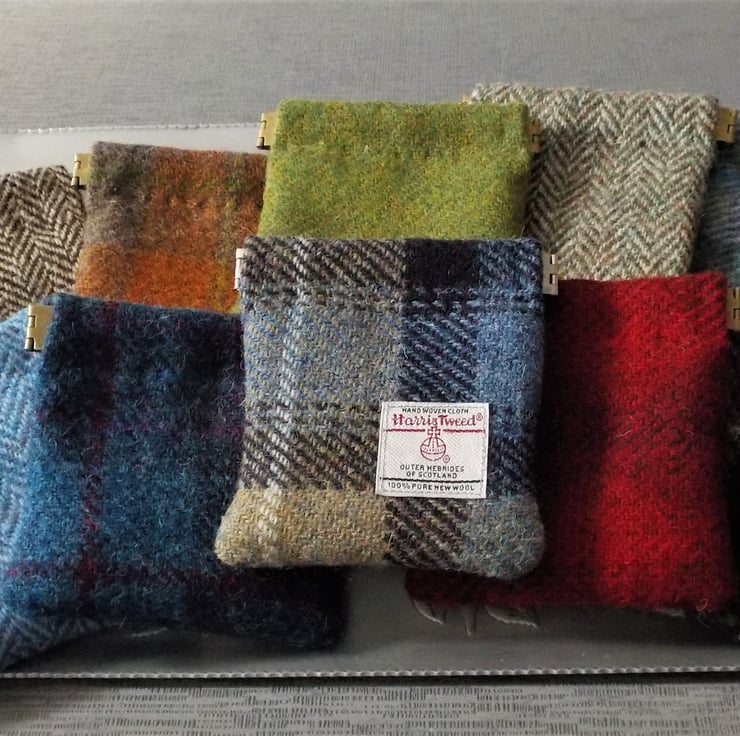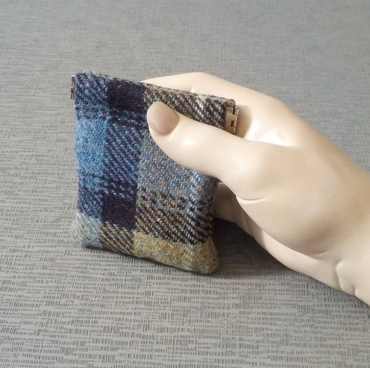 I have made this one from Mackenzie tartan design of the world renowned Harris tweed fabric for the outside, and a toning cotton fabric for the lining. It closes with a flex or spring top to keep your change safe; press the ends inwards and the middle springs open, release them and the top springs closed again. This purse measures approx. 10cm square.