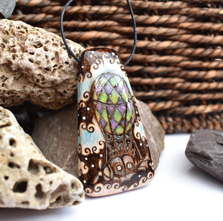A steampunk inspired unusual hot air balloon burned by hand using pyrography and coloured using prismacolor pencil. Ideal for those who long to go up, up and away. It would make a great birthday or wood anniversary gift.