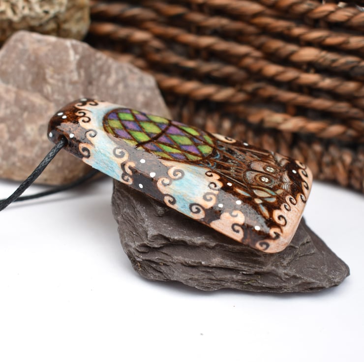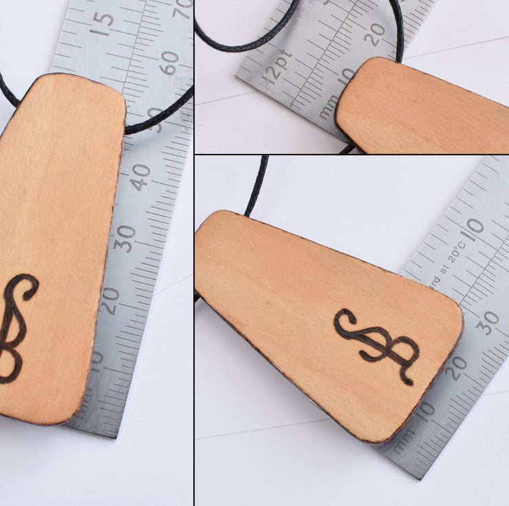 Each item I create is my own design and composition. The reverse is initialled by myself. Each piece is unique. Please note, wood is a natural material and each piece has it's own knots and imperfections that make it beautiful. I seal the wood with varnish to help protect it. To care for your piece; keep in a box or roll when not in use, keep it out of the shower, and avoid spraying with perfume.