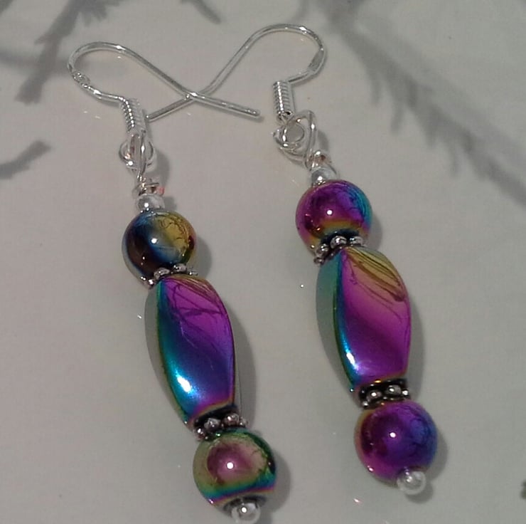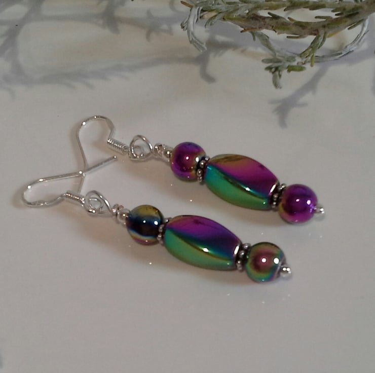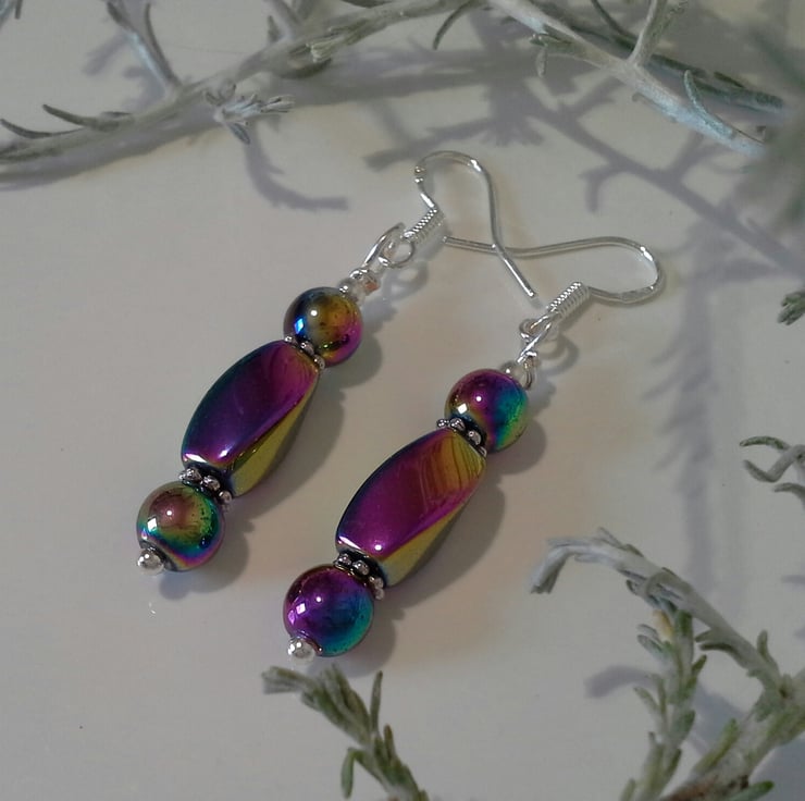 A lovely pair of earrings created from Heamotite gemstones which have had a specialist treated coating applied complimented with sterling silver ear wires with silver plated tiny decorative spacer beads.