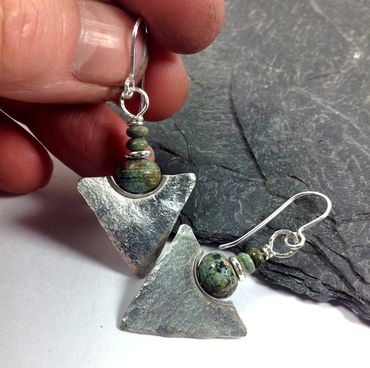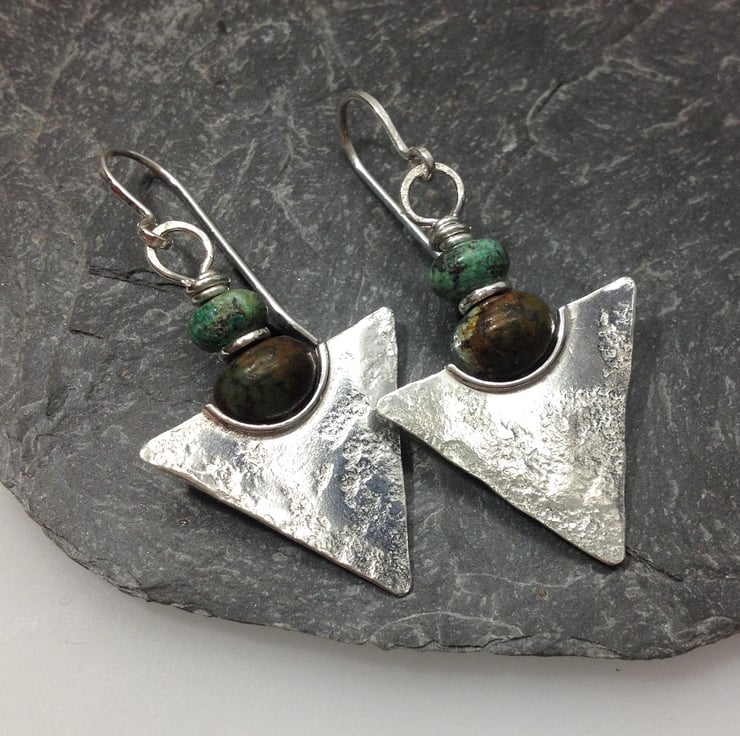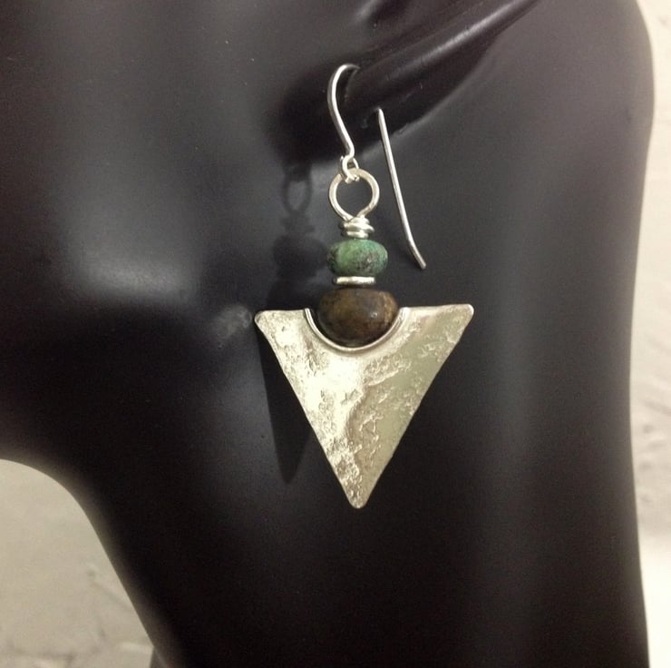 Lightweight triangular dangly earrings topped with blue-green African turquoise roundel beads.
