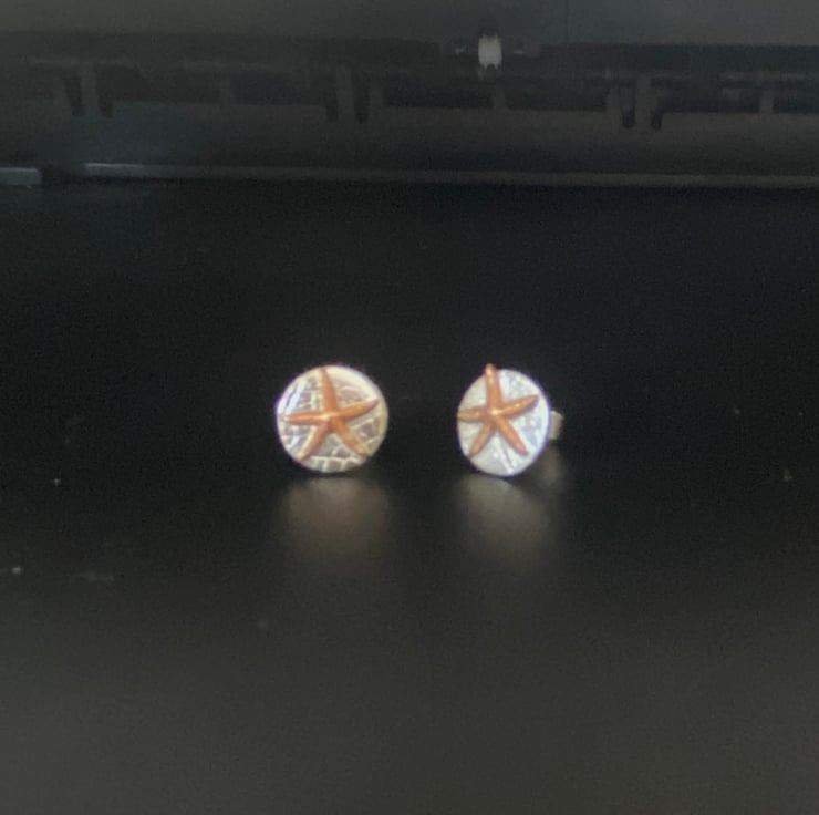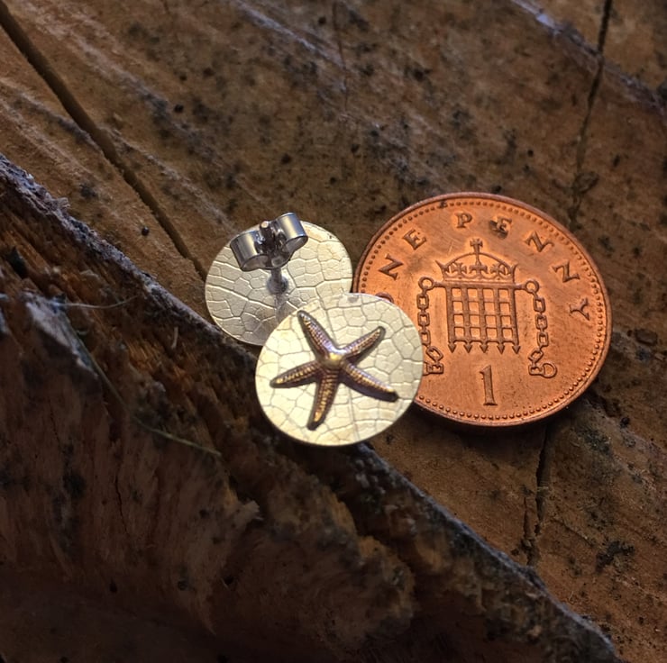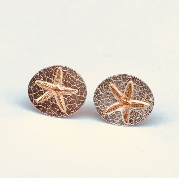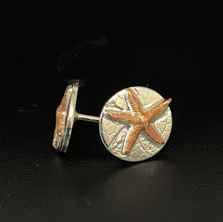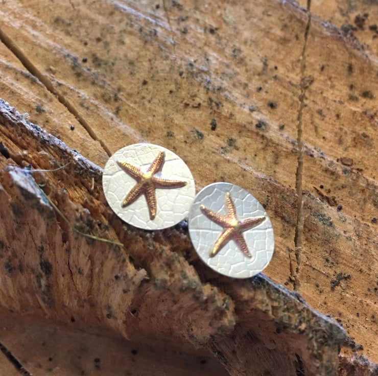 Silver & Copper Starfish stud earrings. Medium size with copper starfish (for added impact & colour) detail on textured Silver. Handmade in Yorkshire.