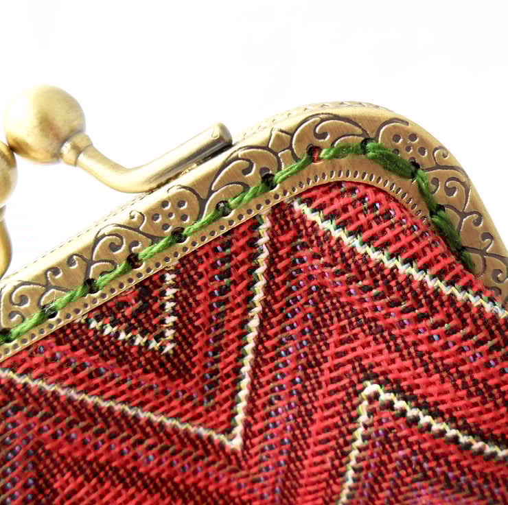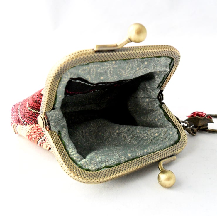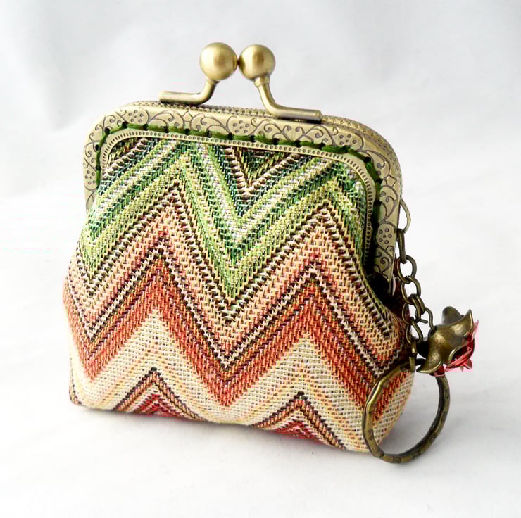 This mini coin purse is handmade from a multi-coloured graduated zig zag fabric. The two sides have been cut from different parts of the fabric resulting in a two sided purse, with mainly red on one side and green and yellow on the other. Two looks for the price of one! It's sewn into a 3" bronze coloured frame with a kisslock clasp, and has a useful keyring on the side. The purse lining is a mint green cotton print.