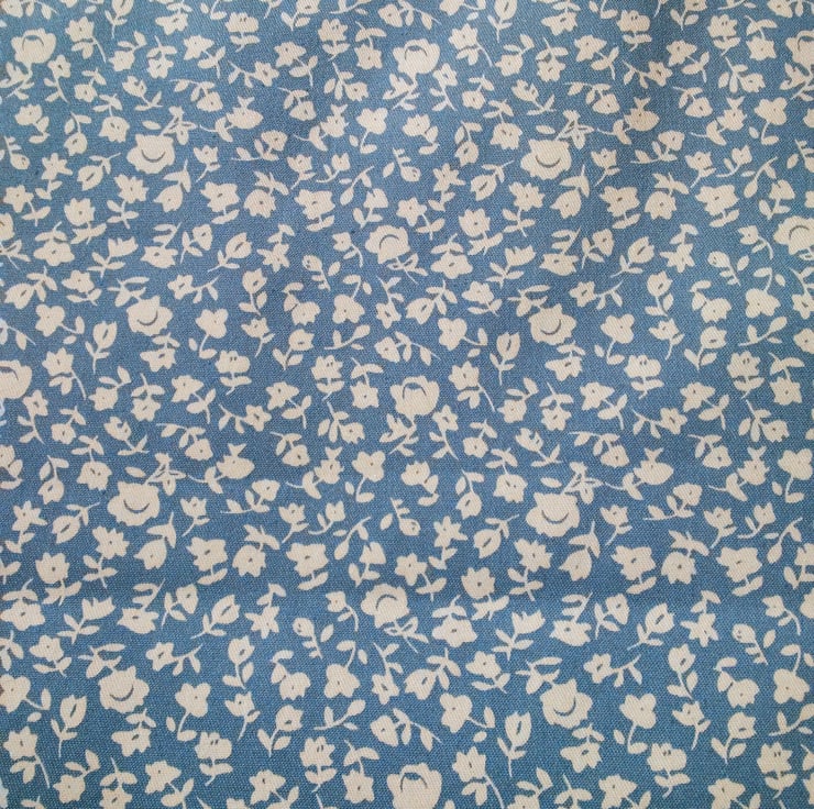 Made from a blue and white medium weight cotton and Spandex fabric. Has a khaki coloured nylon lining, double stitched around the top edge.
