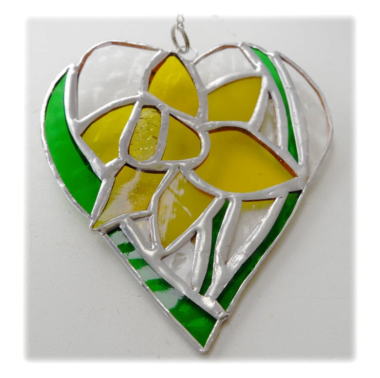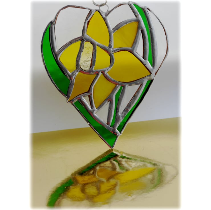 A new addition to my flower heart range. A daffodil, bright yellow with strappy green leaves. The flower is enclosed in a heart shape with the surrounding glass in clear, gentlyy textured glass.