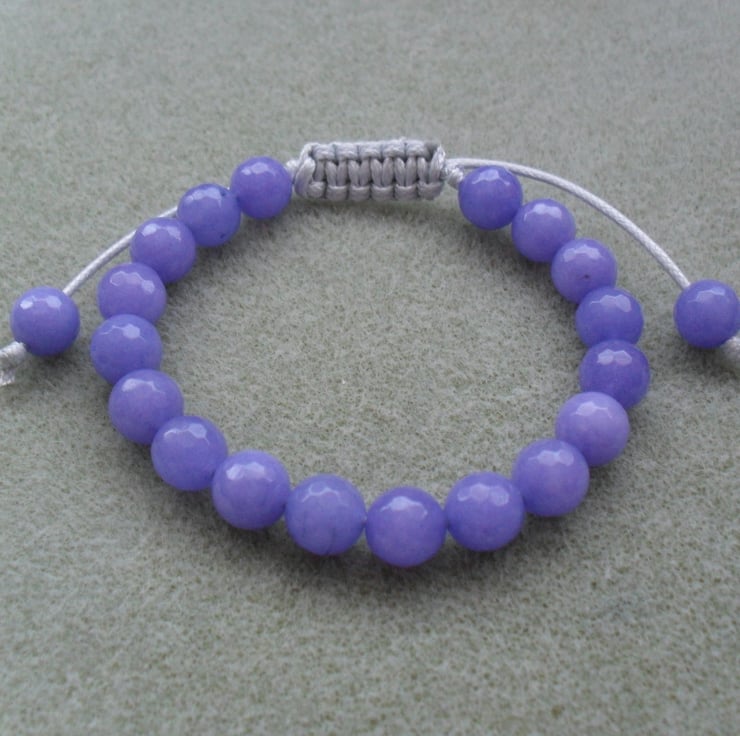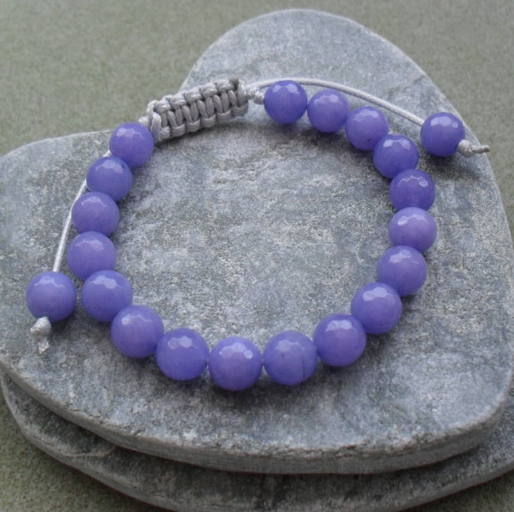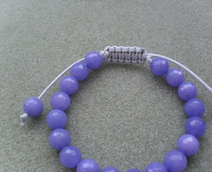 Faceted dyed quartzite beads which are a light purple /lilac colour have been beaded onto silver grey coloured waxed cotton cord with a macramé sliding knot which can slide open to adjust the size of the bracelet