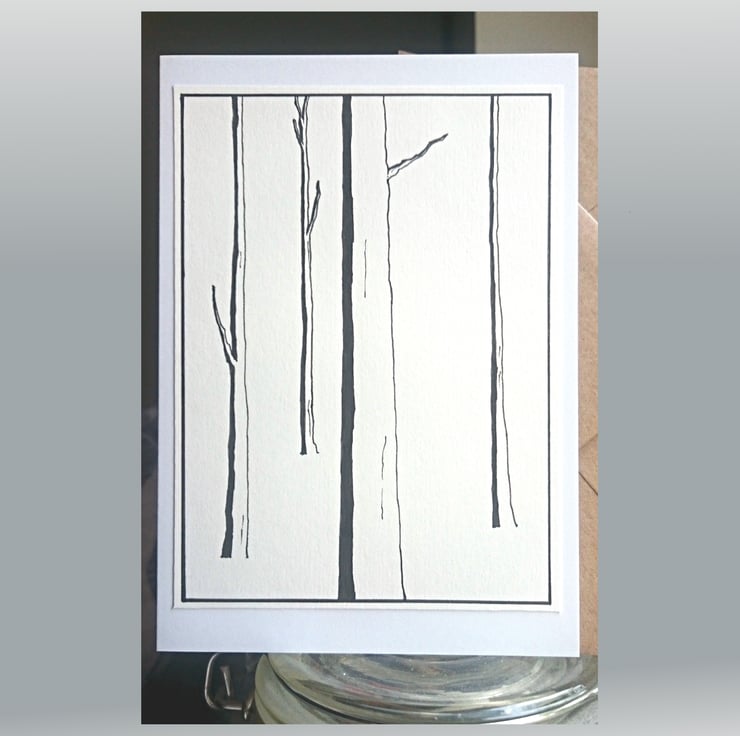 A trees design, 4 in a forest scene, hand drawn on off-white/cream paper, cut and affixed to A6 (105mm x 148mm) white card. Each image is individually drawn in pen, meaning that every card is unique.