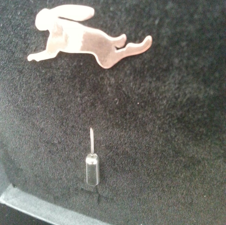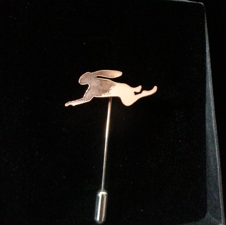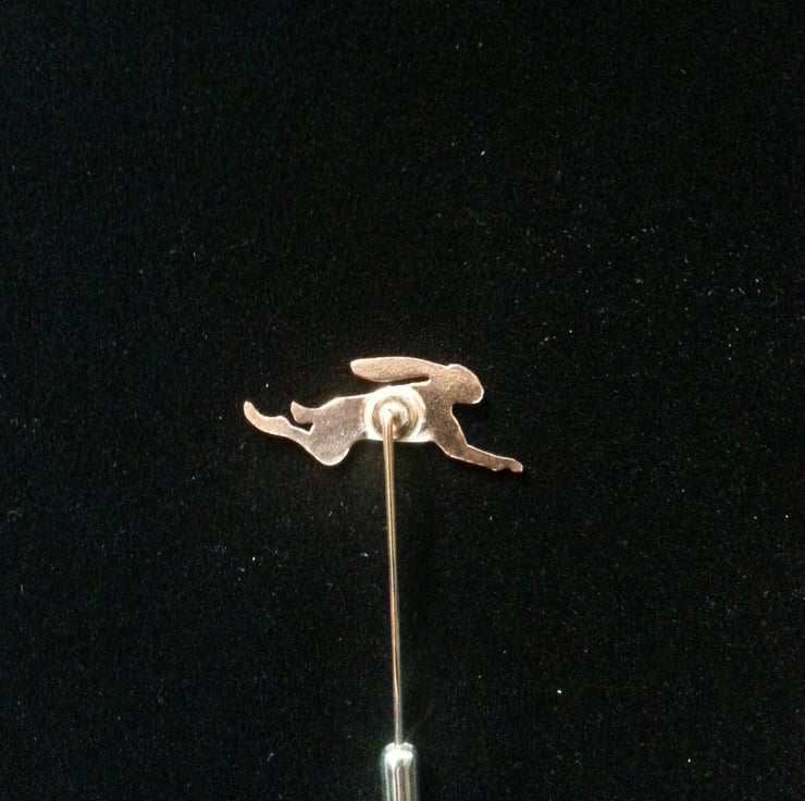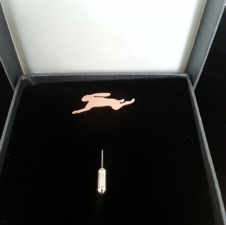 These little Hares like the rest of this collection are developed from my sketches of Hares , so are truly original. The Hares are hand pierced from Copper sheet , then refined and soldered onto a silver plated pin after a polish the protective end cap is added.