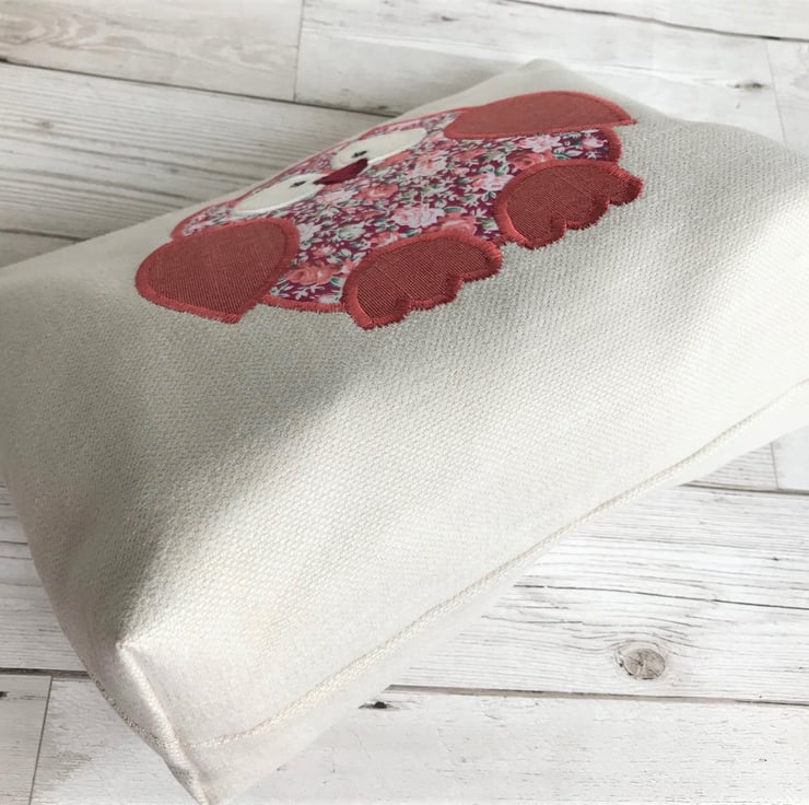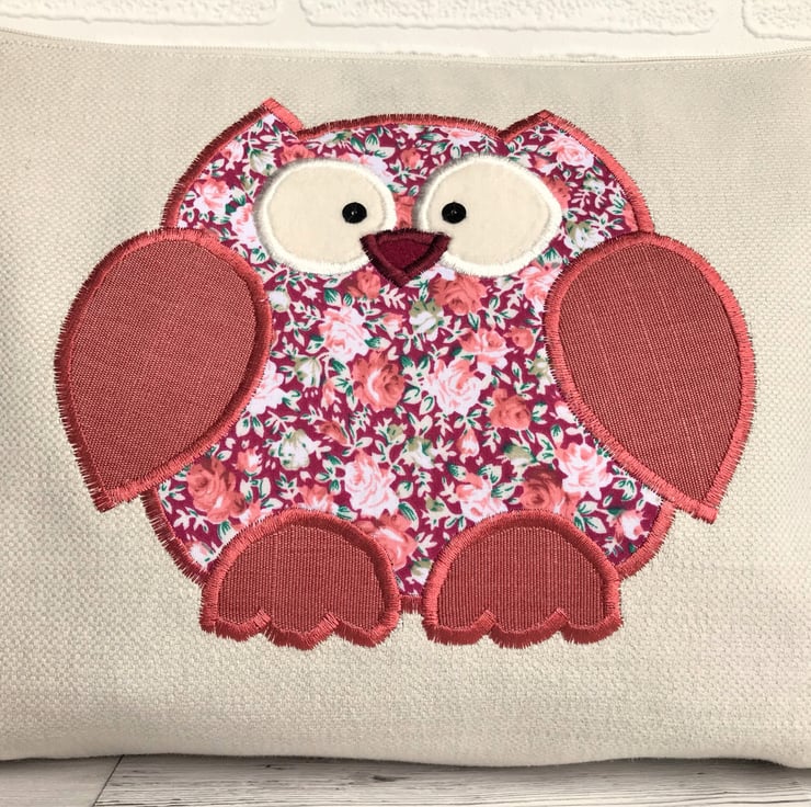 A cute owl toiletry bag in cream fabric with an applique owl. The main body of the owl is made from a floral print fabric in shades of red, pink and green on a dark red background. The wings and feet are brick red fabric. The owl has a dark red felt beak and cream velvet eyes embellished with black sequins. The wash bag has a cream zip and is fully lined with red water-resistant fabric. The base of the bag is boxed to give lots of space for all those essential items.