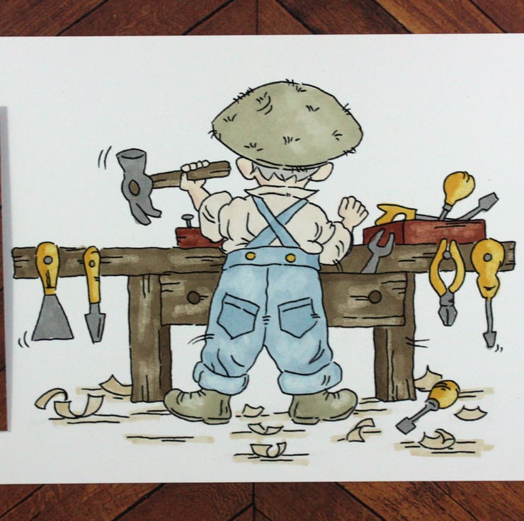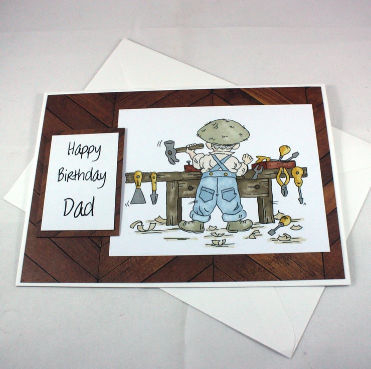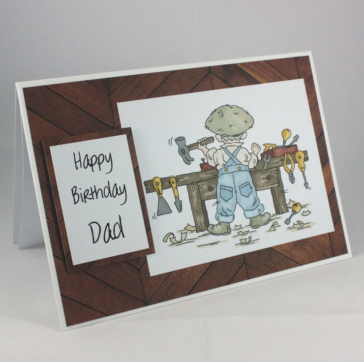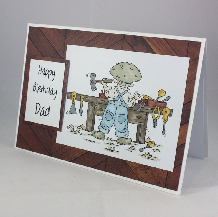 The card features a hand coloured image of a man busy at his work bench. The image is on a wood effect background paper, as is the sentiment, which reads: 'Happy Birthday Dad'.