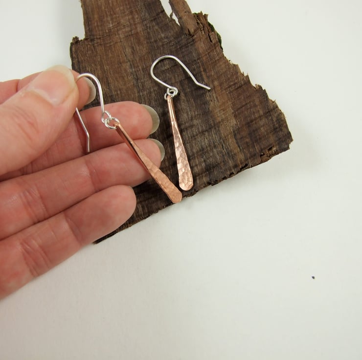 Copper strips have been hand cut, drilled and hammered to create a light textured effect. Paired with .925 Sterling Silver Earwires and fittings. Alternative stud and butterfly fittings are available, please note in comments at checkout if you would prefer stud fittings.