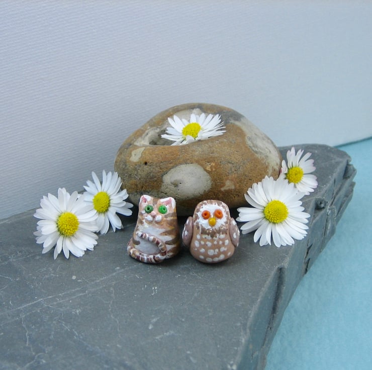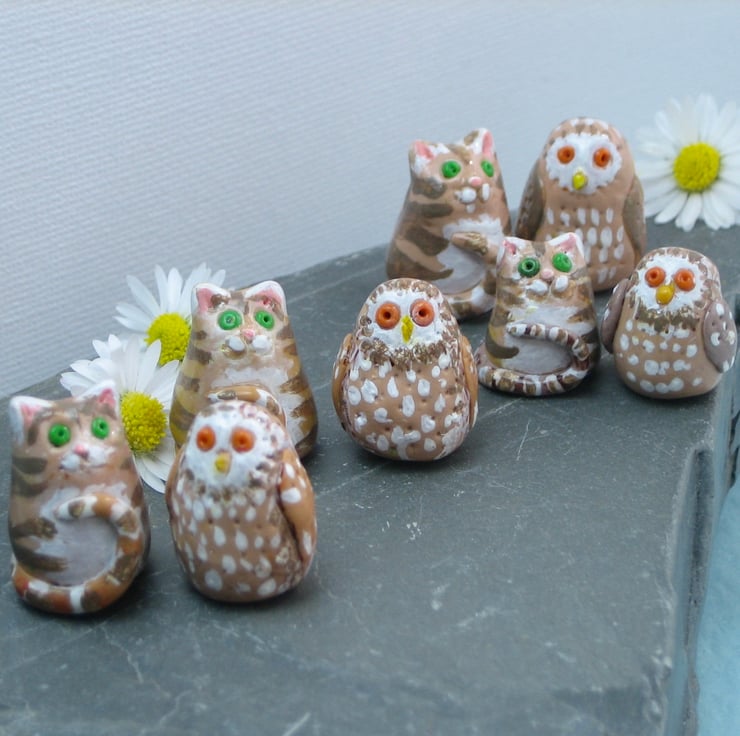 Tiny Owl and Pussycat models handmade in polymer clay and finished with acrylic paints and glossy varnish. This is couple number 3, and the smallest of my current collection at just 18mm high.