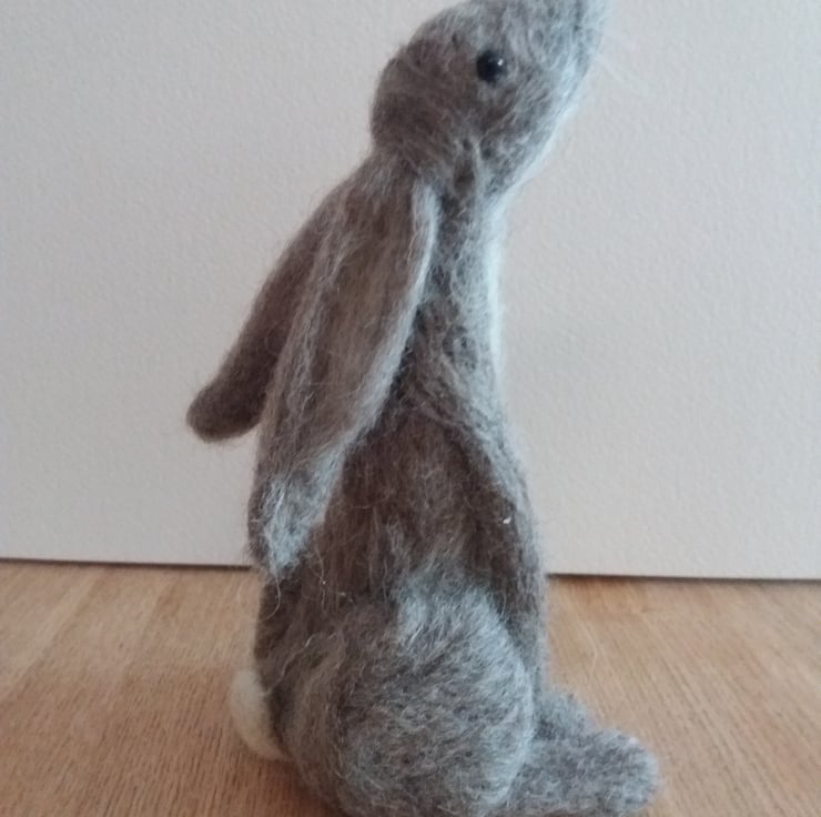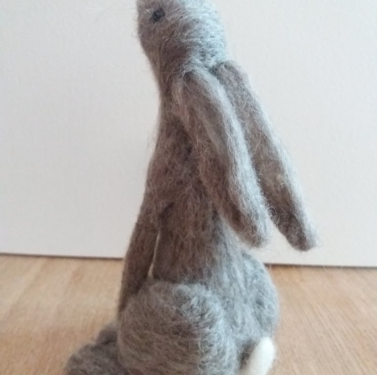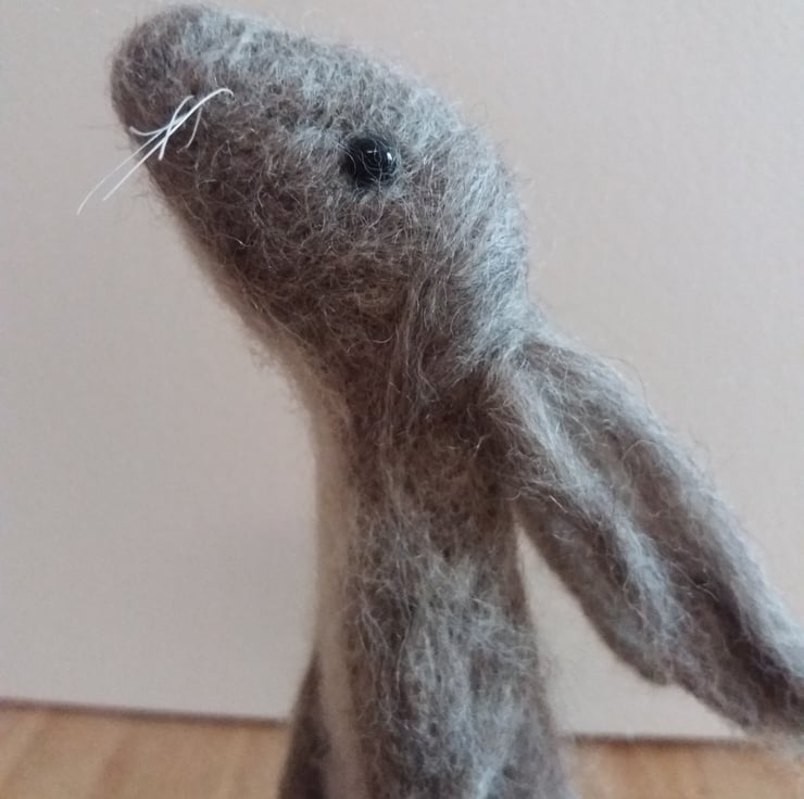 Harvey, the moongazing hare, has been needle-felted using Blue-faced Leicester wool, with a touch of natural Shetland. He has glass bead eyes and horsehair whiskers.
