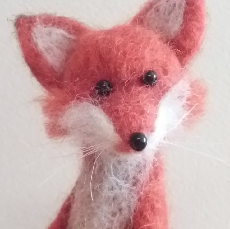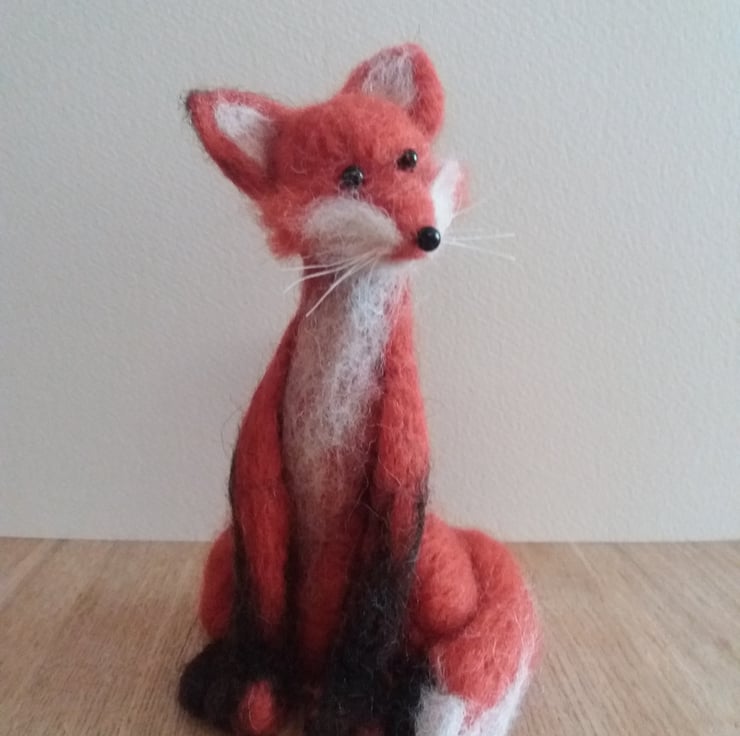 He has been needle-felted using dyed cinnamon Shetland, with natural white and black Shetland wool. He has glass bead eyes and horsehair whiskers.