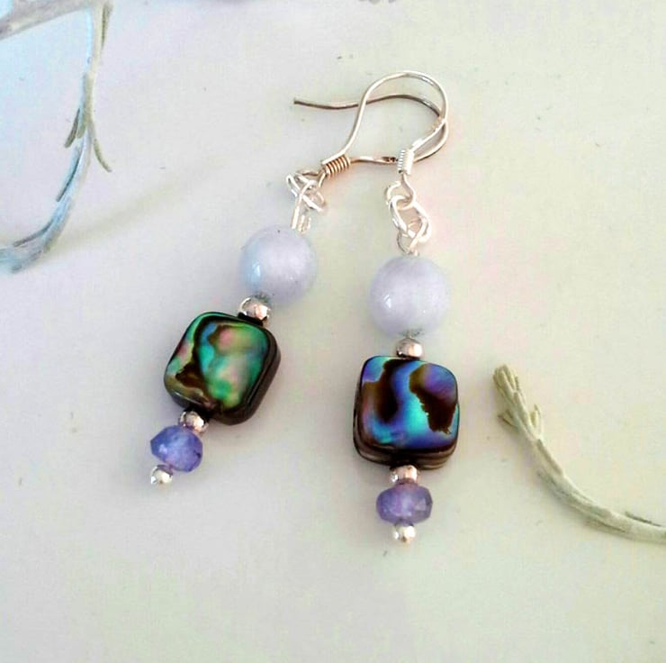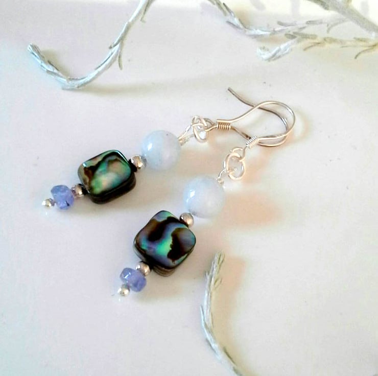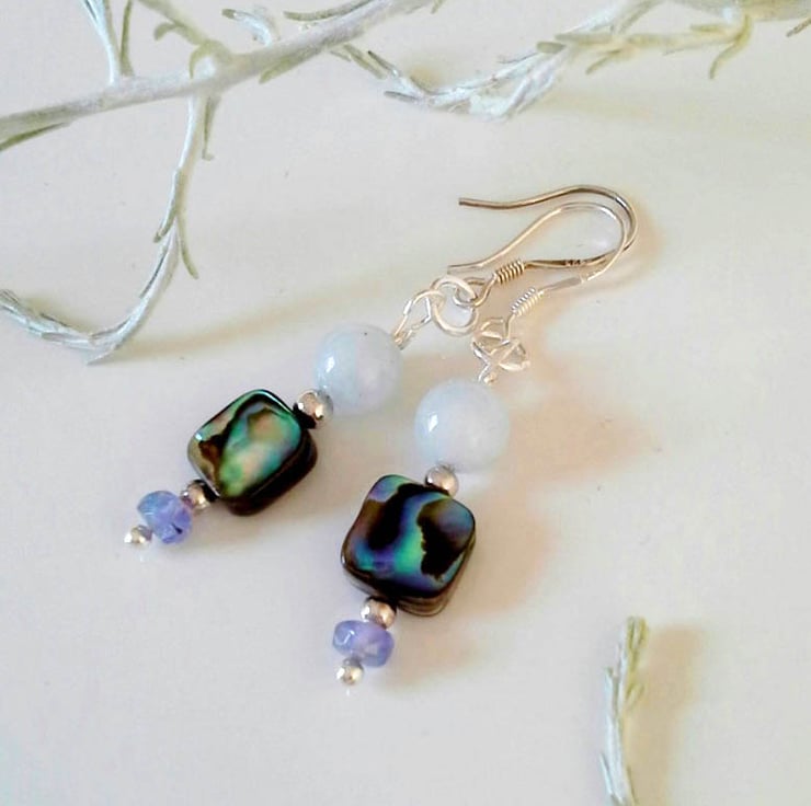 The faceted tanzanite roundels are strong in colour and they compliment the abalone shell and aquamarines beautifully. The will come in a sealed clear polythene bag for hygiene and inspection purposes. A hand made decorated Demelza Designs pillow style gift box will come flat ready for two simple steps to make up ready for gifting the earrings.