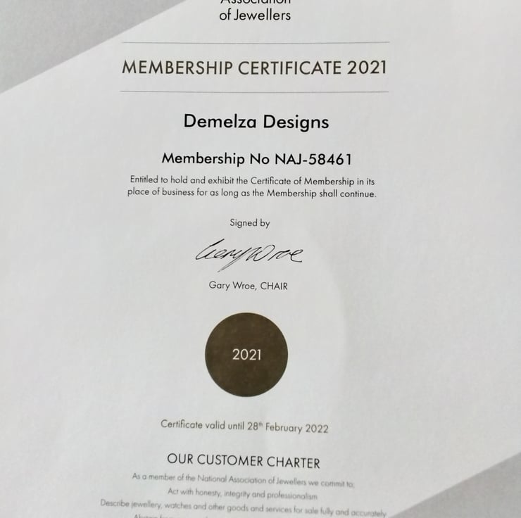 Demelza Designs is a full time small business accredited by the largest prestigious 'National Association of Jewellers' having met their high standards and vigorous vetting processes. This professional acknowledgement provides peace of mind customers receive the goods as described and shown in accordance with current UK distance selling legislation.