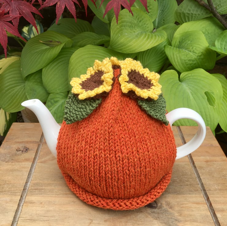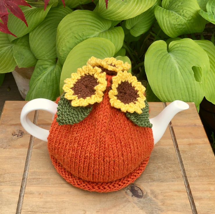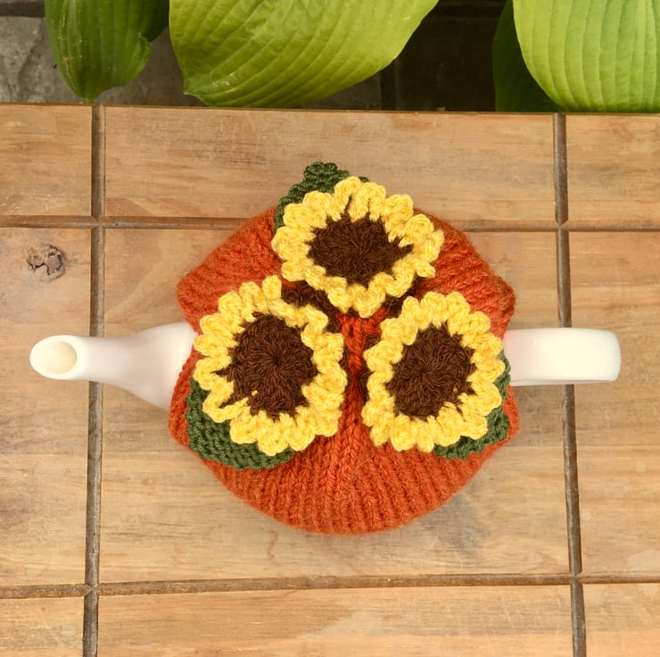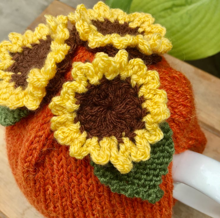 There are three crochet sunflowers with brown centres and yellow petals attached. Three hand knitted green leaves finish this tea cosy off.