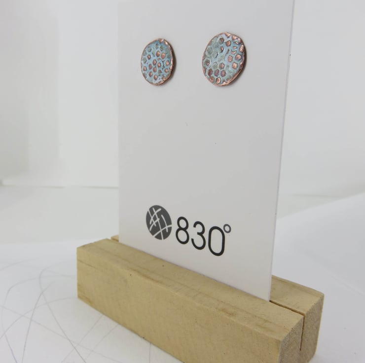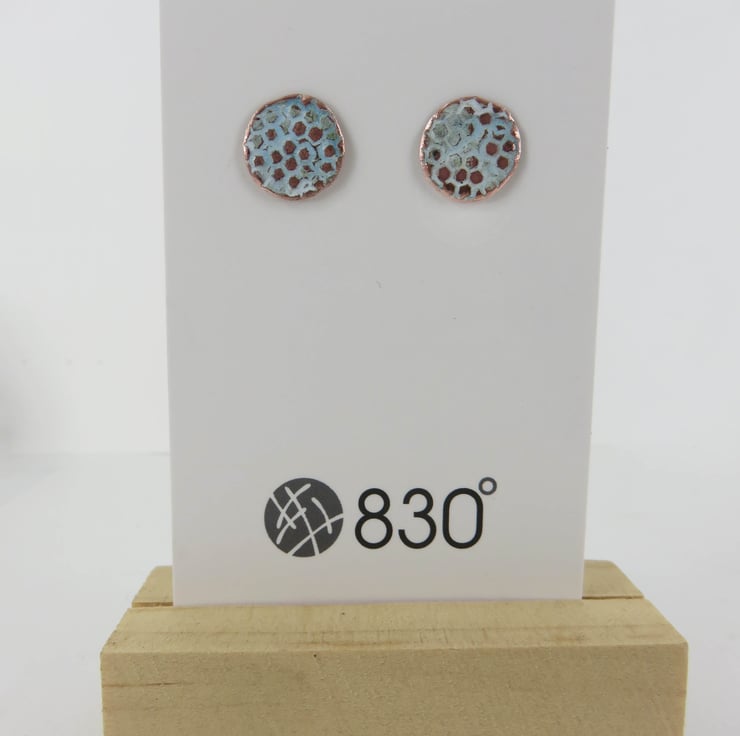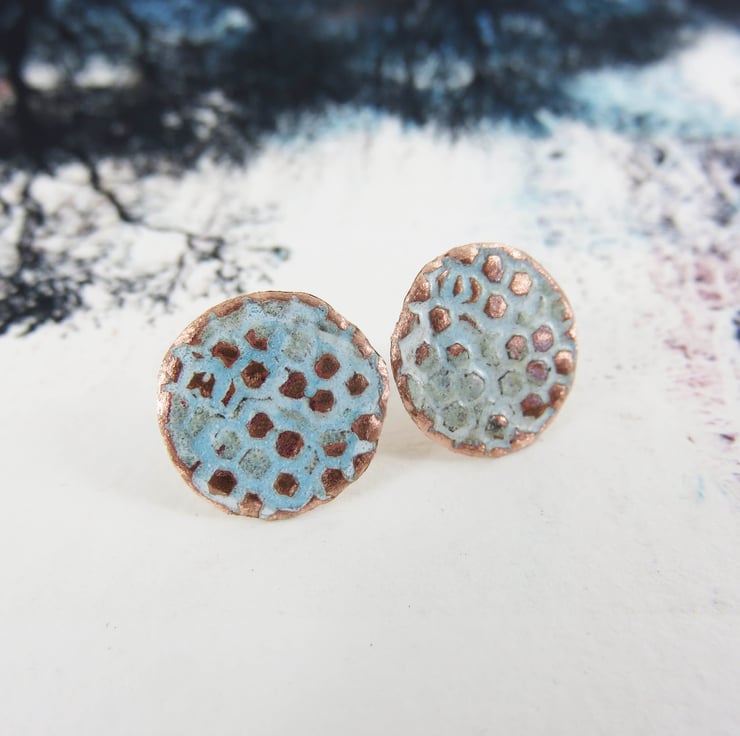12mm circle copper stud earrings decorated with a lacy texture and washed with an white and blue enamel. Some raised areas are sanded back to reveal the copper beneath. Silver posts are soldered on the backs. Fired in the kiln at 830 degrees.