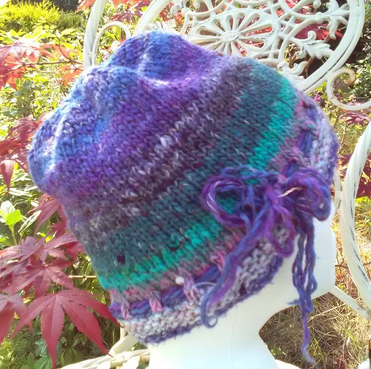 Handknit Noro cotton silk & wool hat Purple Green Pink Blue Medium