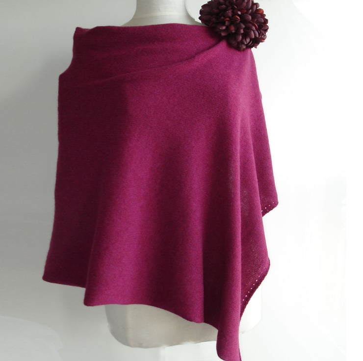 Simple asymmetric poncho in fabulously soft British spun merino lambswool that drapes beautifully and is great to throw on over a t shirt or wear to a smart occasion with the addition of a broach or flower as we have shown in the image. The colour is a rich plum.