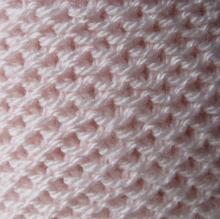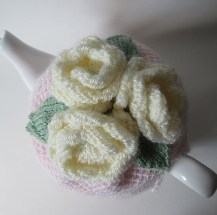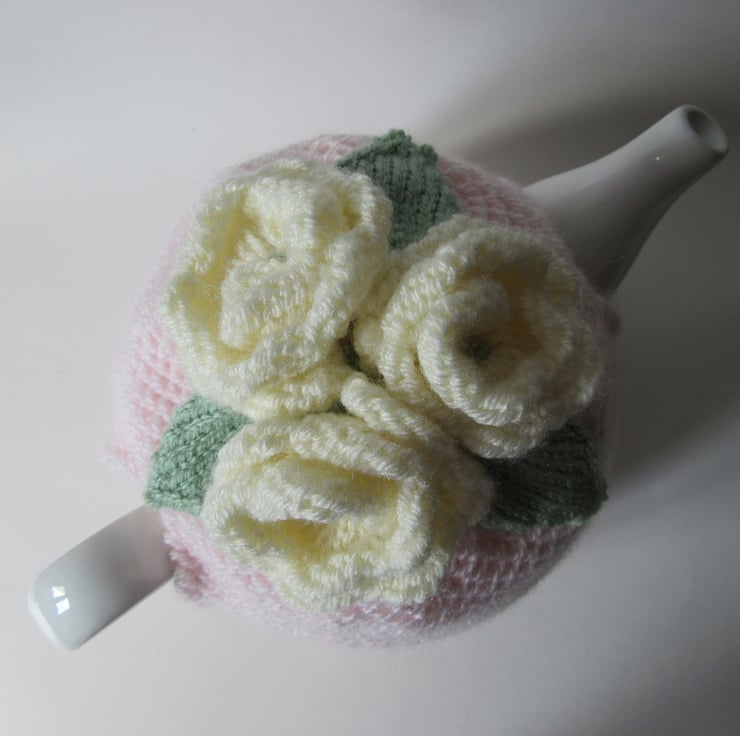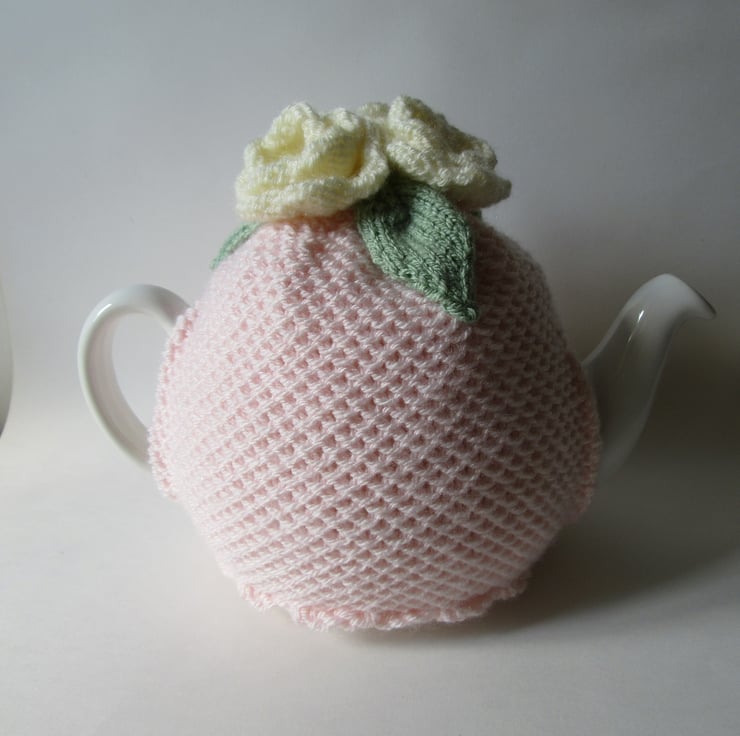 A beautiful hand knitted sweetest sorbet pale rose pink coloured tea pot cosie. The body of the tea cosie is knitted in a honeycomb stitch with a twisted scallop hem using the palest of rose pink coloured yarn. This stitch gives a wonderful texture to the cover. Nestled on the top are three cream knitted roses and three green leaves.Generously knitted to fit snuggly round the pot, yet has enough ease for a swift removal when a 'top up' is required.The tea pot handle peeps through the side opening so it dosnt get too hot to handle.