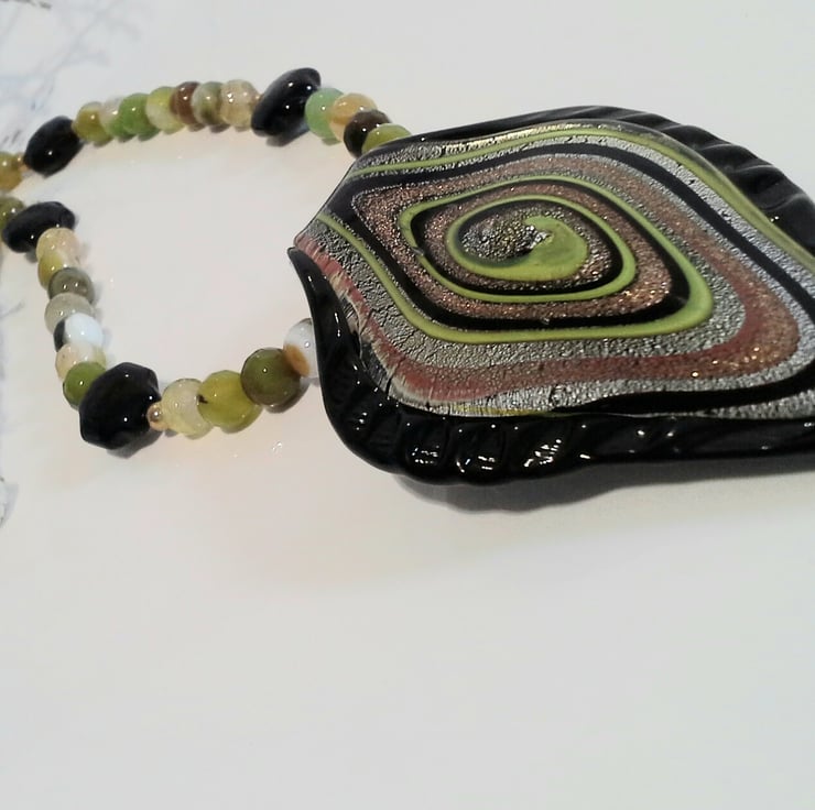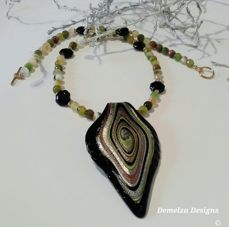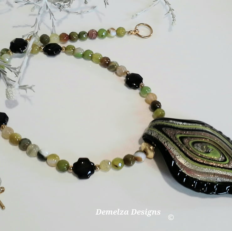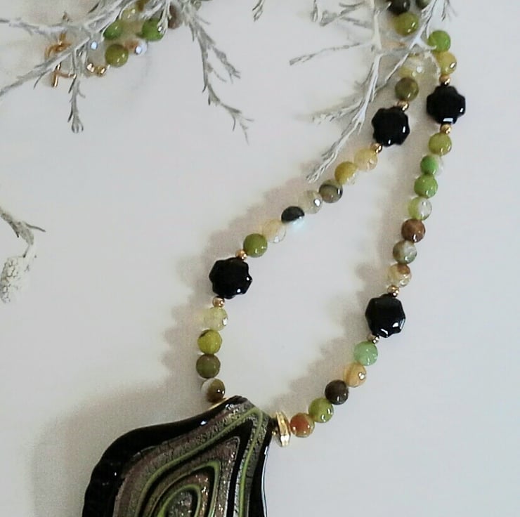 A fabulous luxurious necklace designed and created using hexigan shaped cut black agates and green faceted stripey agate round gemstones. In the centre sits a large marano glass pendant. This necklace will look stunning worn for everyday wear or for formal evening occasions. It has been constructed using professional stainless steel jewellers wire for added strength and lasting durability, finished off with a gold plate toggle style clasp and small beads.