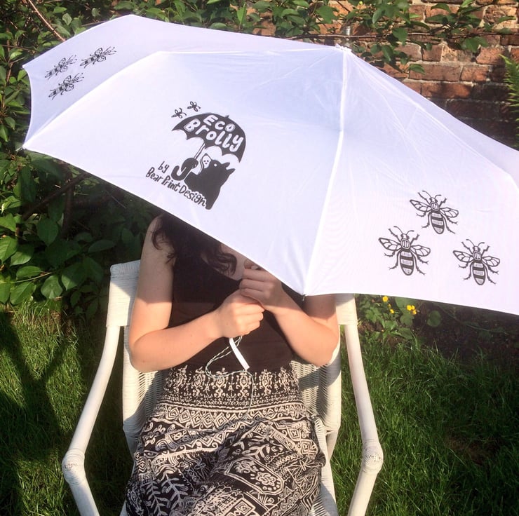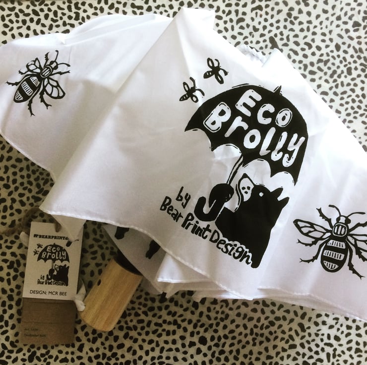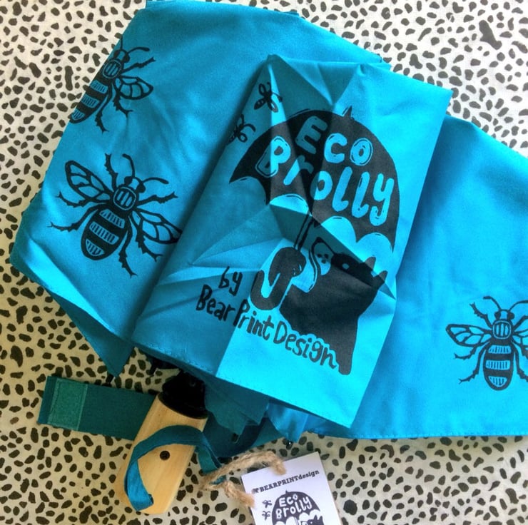 This is a beautifully constructed telescopic umbrella screen printed with my EcoBrolly logo and Manchester Bee lino print design. Available in a lovely fresh white or turquoise blue, the canopy is made from recycled plastic bottles and this brolly has already won a sustainability award. It also sports a bamboo handle and its windproof system and automatic opening make it a delight to use! Please state colour choice on your order, sent first class post so hopefully the rain won’t catch you out.