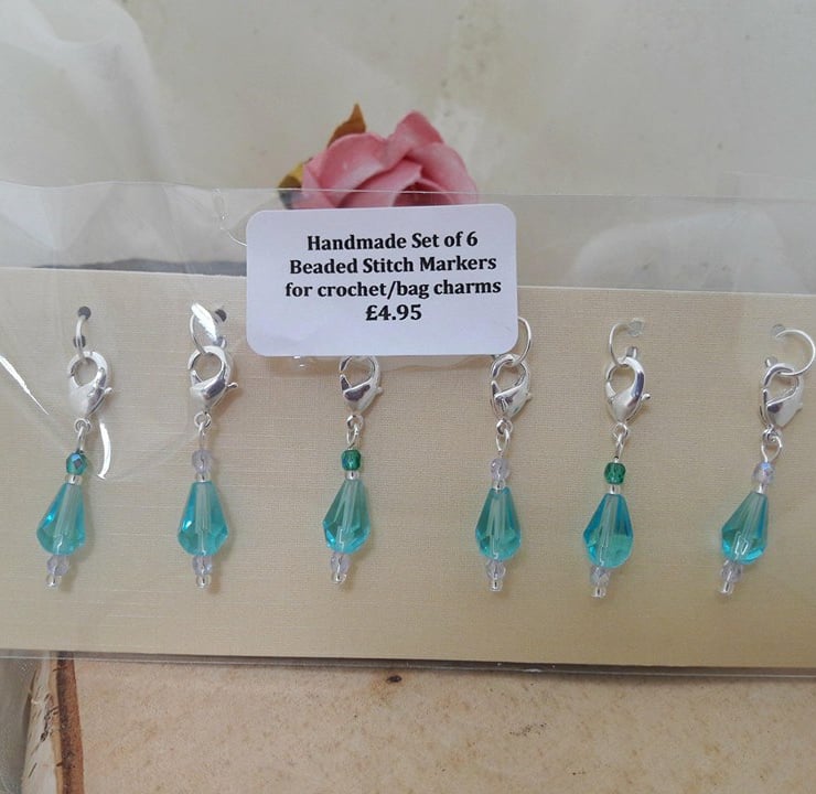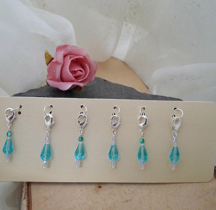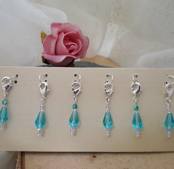 Handmade set of 6 crochet stitch markers, made with blue glass teardrop beads and topped and tailed with Firepolished Czech crystals. A smooth opening 12mm lobster clasp, which makes it easy to slip onto your crochet project.