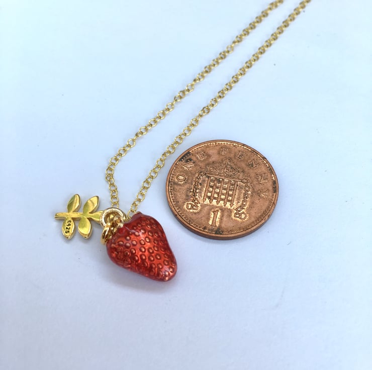 Strawberry Necklace Gold plated silver necklace with Enamel Details in Red and Green.