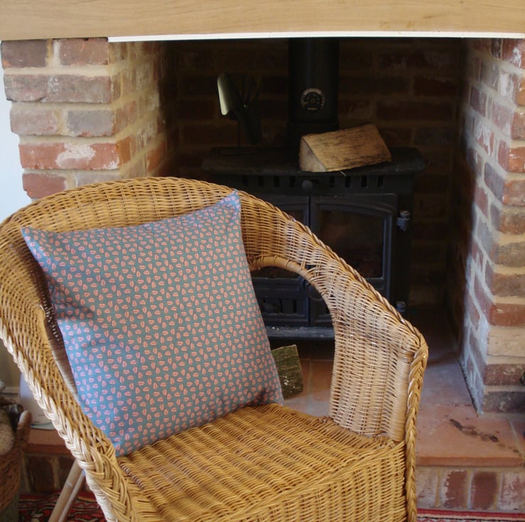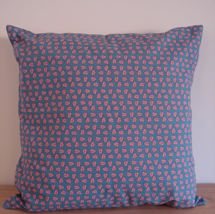 A beautiful cushion cover in deep turquoise with pink leaves forming a geometric pattern. This cotton cushion cover fits a 16" pad (not included) and has an envelope back.