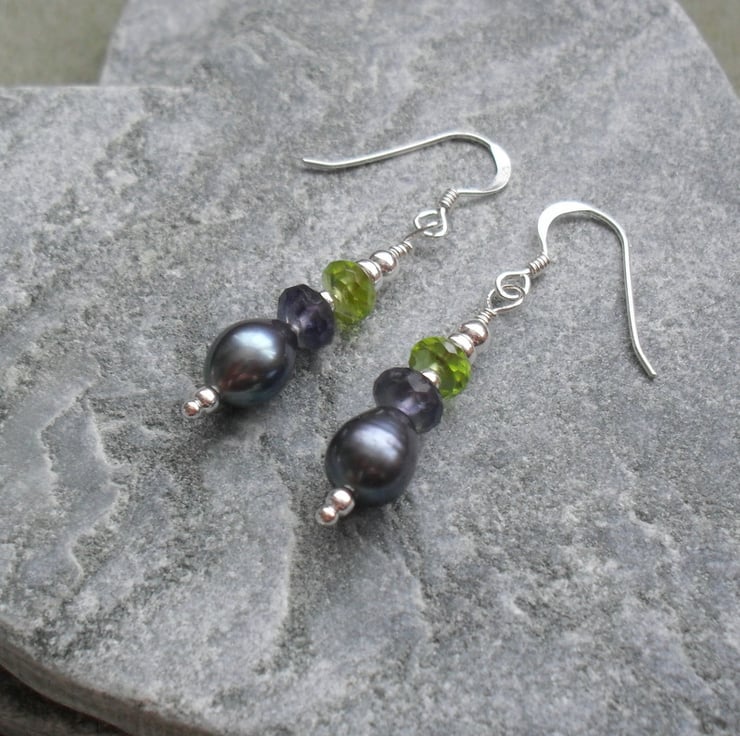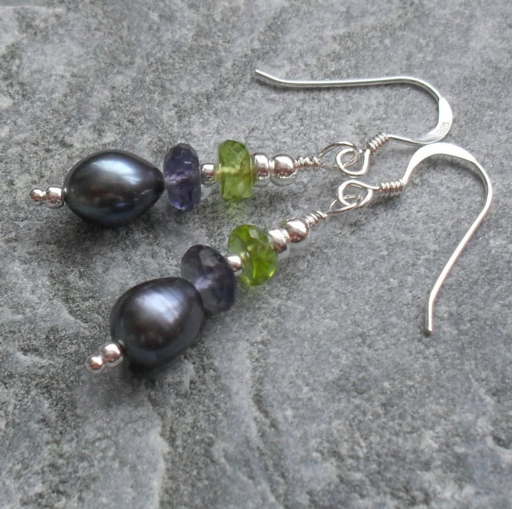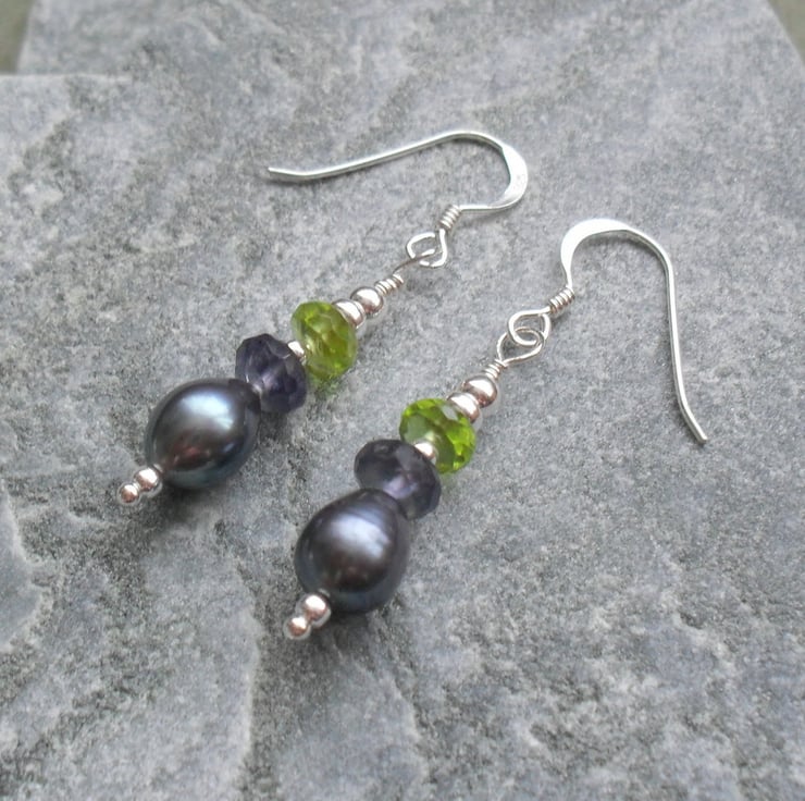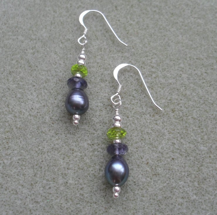 Peridot, Peacock blue freshwater pearls and Iolite semi precious gemstones with sterling silver beads are attached to sterling silver ear wires