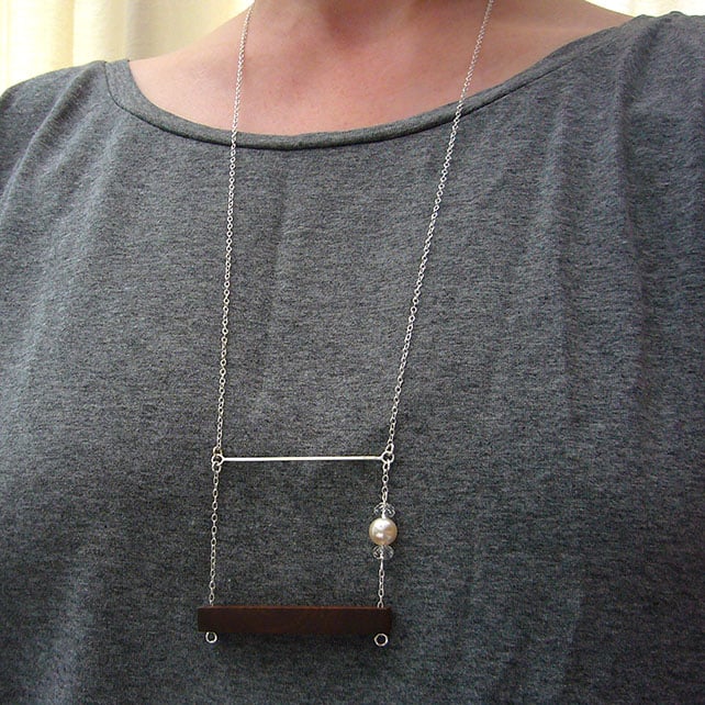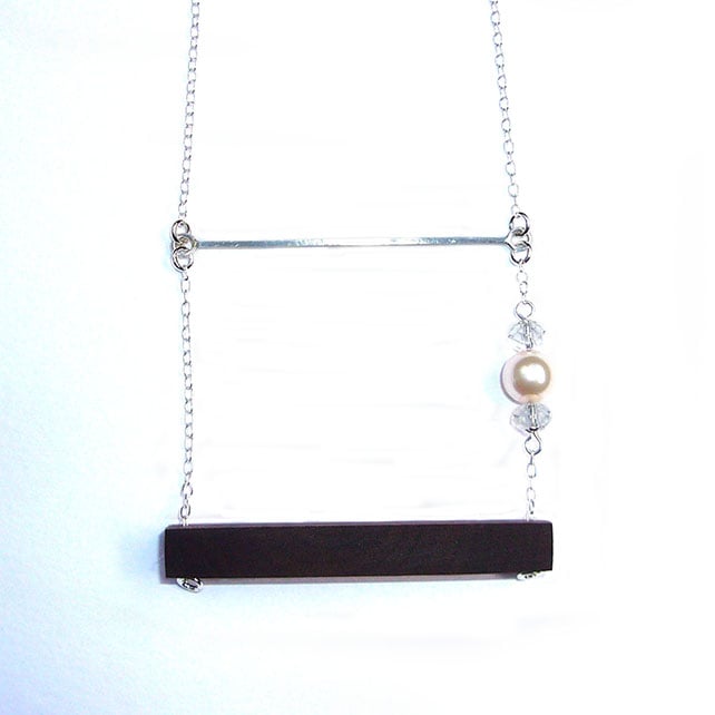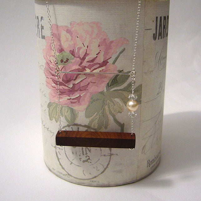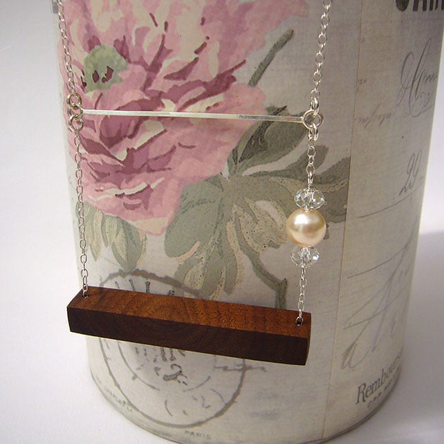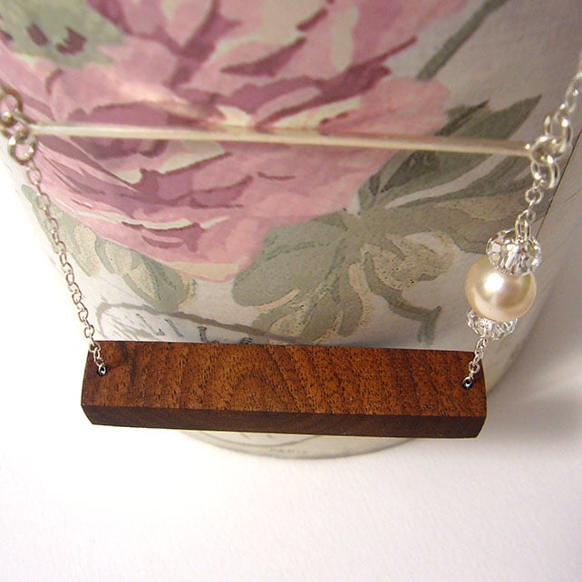 Imagine a piece of jewellery that is simple yet unique. This walnut & sterling silver necklace has been designed by Mandie, and is part of a collection of walnut based necklaces. The walnut has been cut by hand, and, using chain, has been attached to sterling silver square wire, pearl & crystal beads.