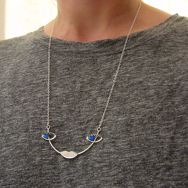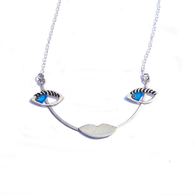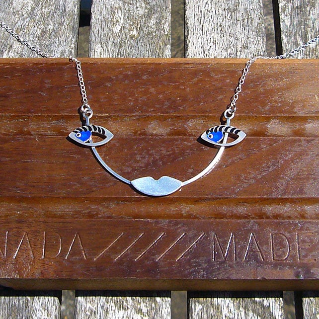 Are you searching for a piece of jewellery that is unique & quirky? I designed this discontinued sterling silver necklace after being inspired to make necklaces of simplistic faces. All shapes have been cut by hand from sterling silver, soldered to square wire and finished with enamel paint.