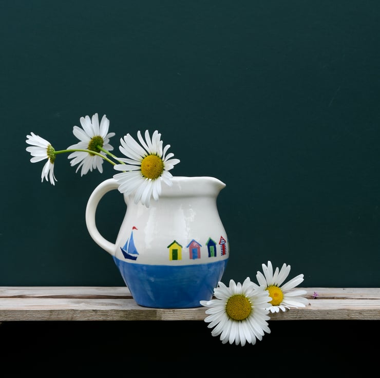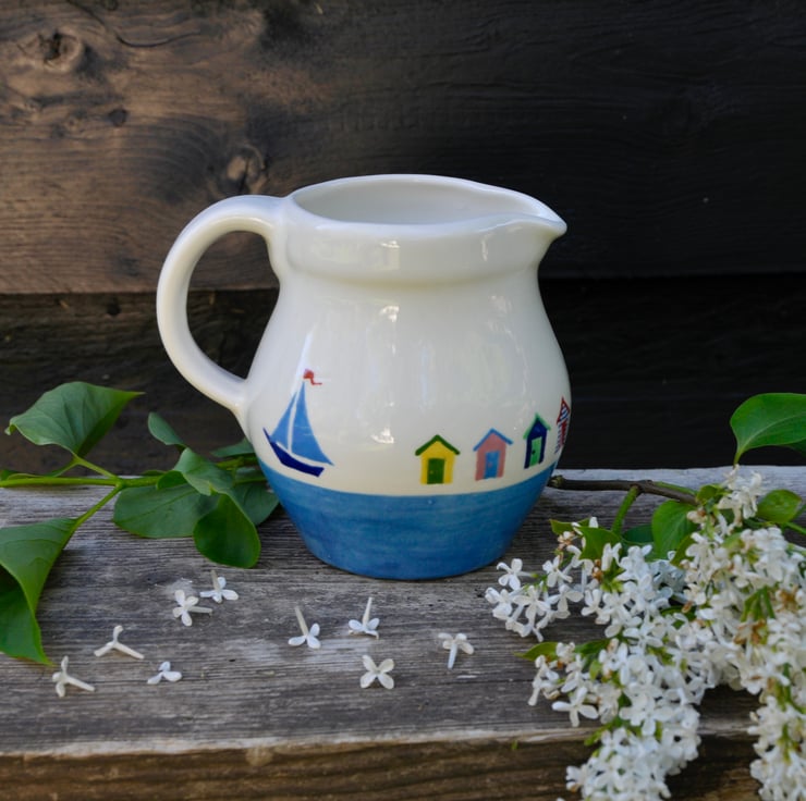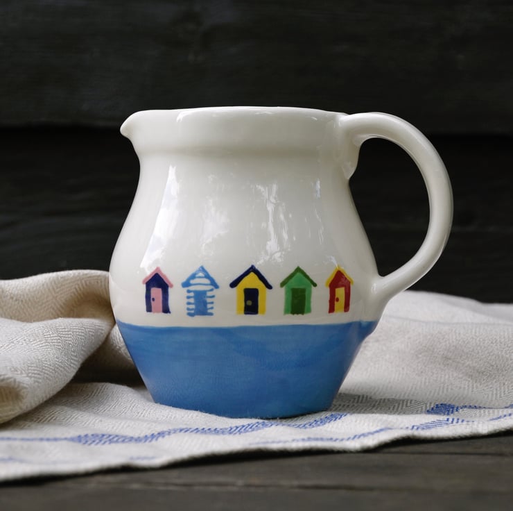 This Beach Hut Rustic Pint Jug is hand painted with little beach huts it is perfect for a pint of milk or custard. You can never have too many jugs!.