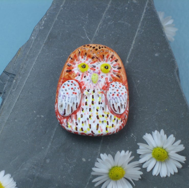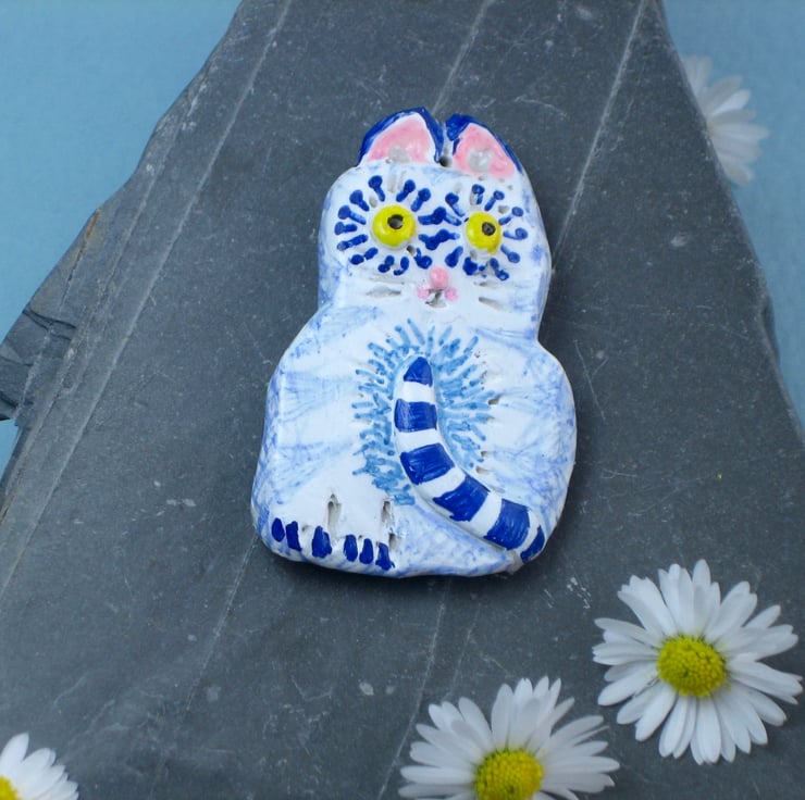 The owl, the cat and the rabbit have each been handmade in air-dry clay, painted with inks and acrylic paints, then finished with a protective coat of glossy varnish.