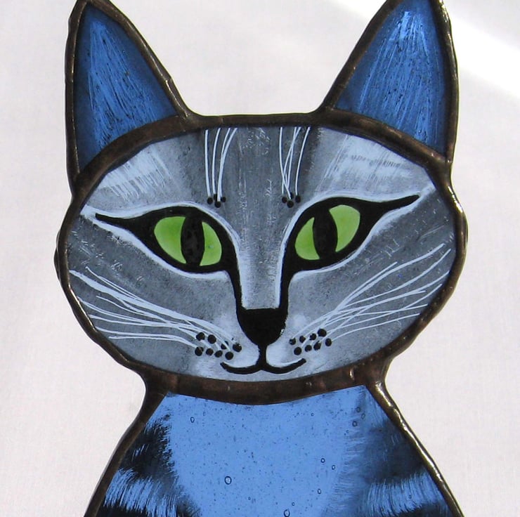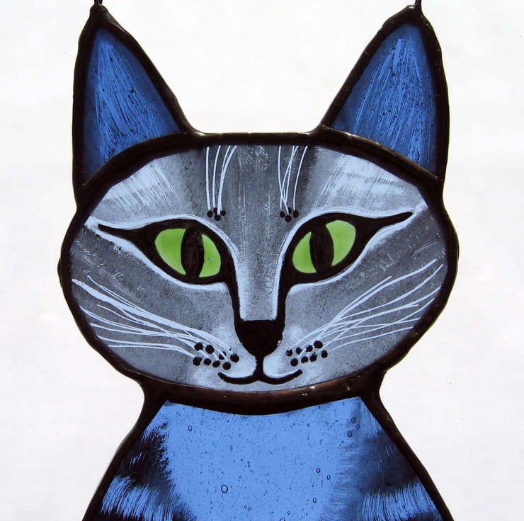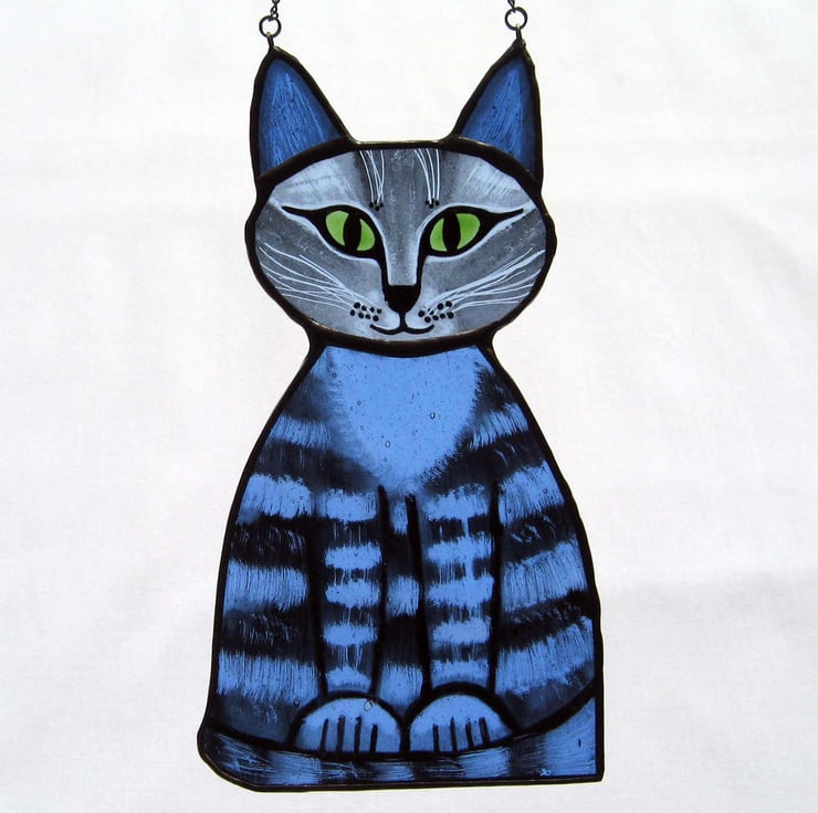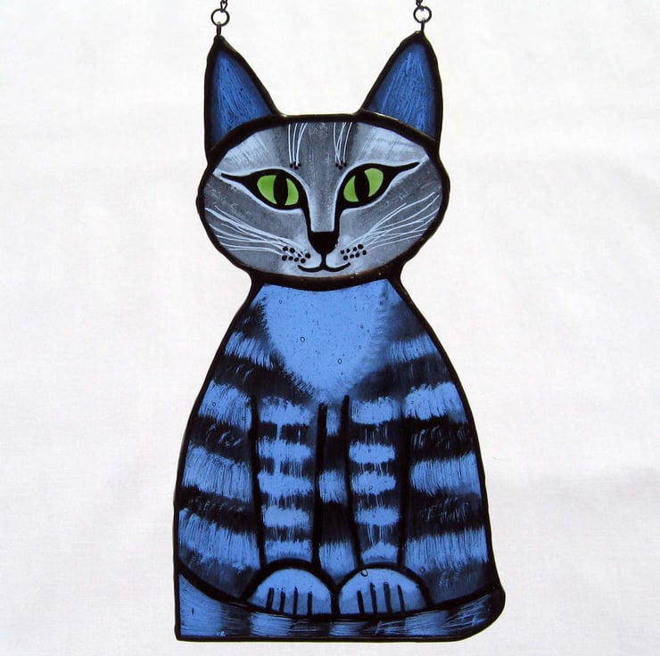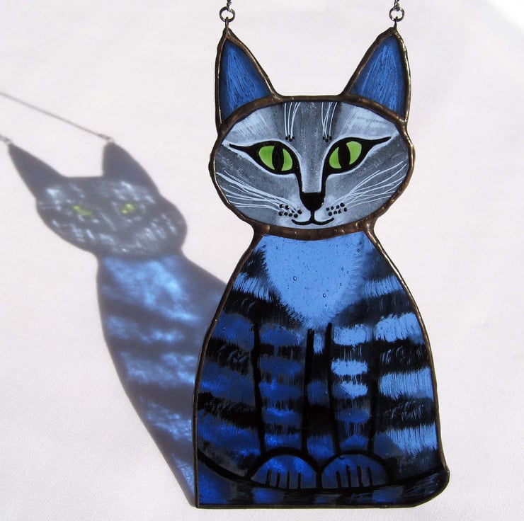 Created using traditional stained glass techniques and materials this blue cat light catcher has been hand painted onto antique style, blue glass and fired in a kiln. The detailed line and shading paint is fired first and in a second firing a touch of colour enamel is added for the cats eyes. At high temperature the paints fuse together with the glass making the image permanent and enduring.