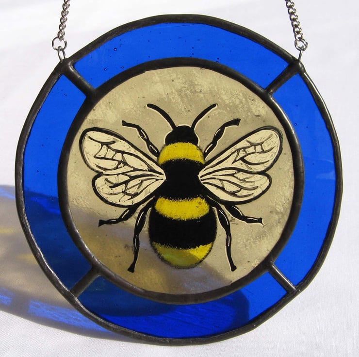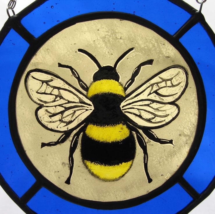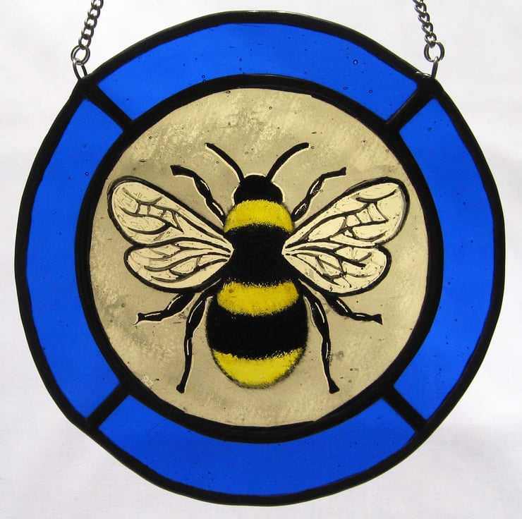 The bumblebee has been hand painted onto light amber, antique style glass and fired in a kiln at high temperature making the image permanent and enduring. In a second firing the rich yellow bands have been applied with enamel completing the bee image.