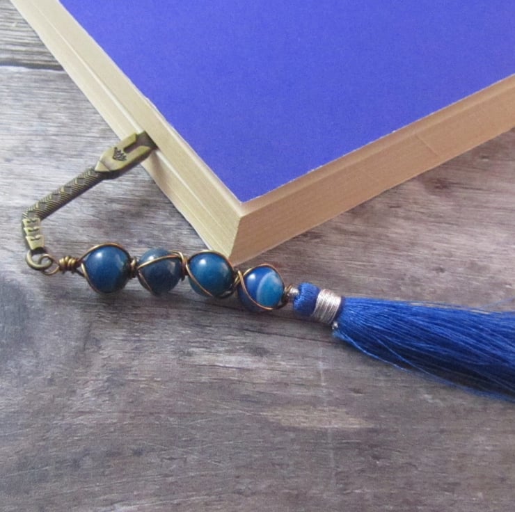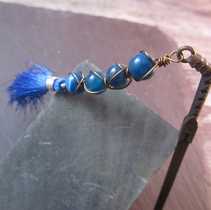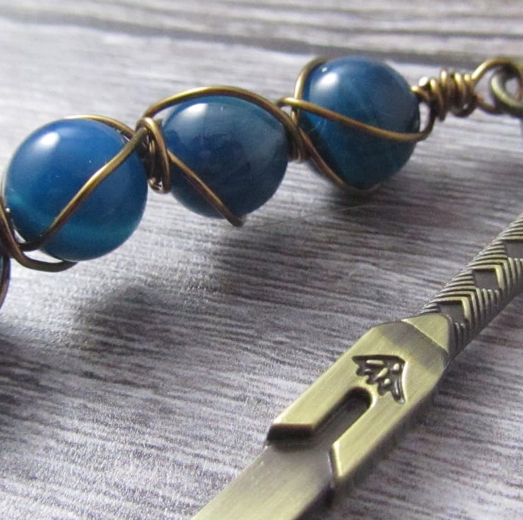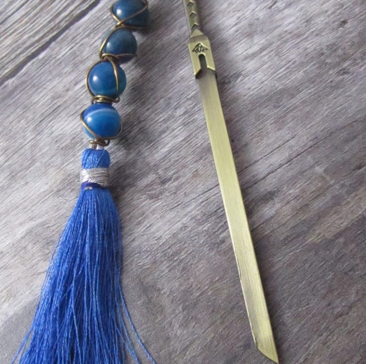A gorgeous blue agate wire wrapped sword bookmark. It is created with real striped blue agate gemstones, antique bronze colour silver plated copper wire, a tassel, and the bronze colour sword is a zinc alloy. This bookmark is the perfect gift for those who love swords, fantasy or reading.