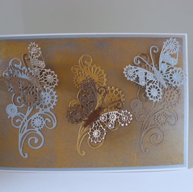 The three swirls in gold, silver and antique gold, have cogs wheels attached, and then topped with cog wheel butterfly's.