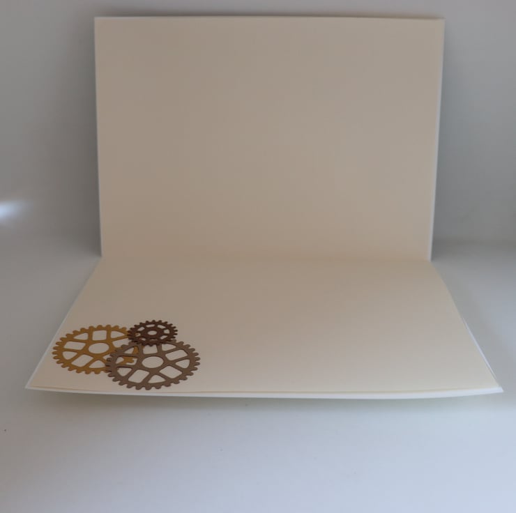 This card is A5 in size and the base card is coconut white, and is 220 gsm in weight, this card is lined with vellum an has 3 cog wheels in the bottom left corner.