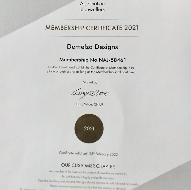 Demelza Designs is a small professional business accredited by the largest prestigious 'National Association of Jewellers' in 2015 having met their vigorous vetting processes and high standards expected within the UK jewellery industry.