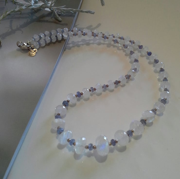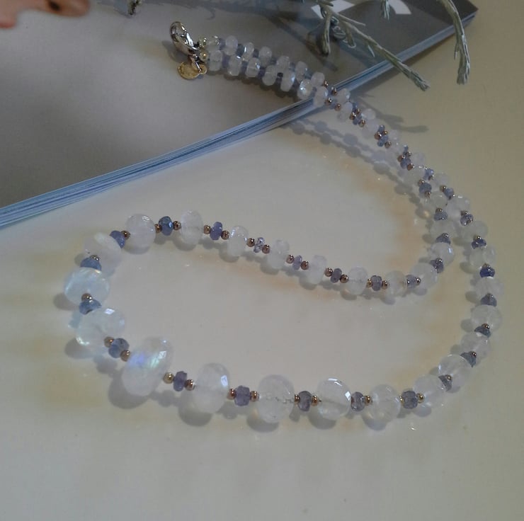 A beautiful necklace designed using extremely good quality faceted Sri Lanka Moonstone roundels with breath taking blue shiller going through them as any light source hits each gemstone. The smaller graduating in size faceted AA tanzanite roundels have a good strong colour which deepens under candecent lighting due to it's triquick natural properties. Between each tanzanite are tiny 925 sterling silver spacer beads. The necklace has been constructed using professional stainless steel jewellers wire for added strength and lasting durabilty, finished off with a sterling silver clasp.