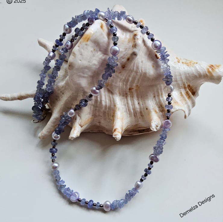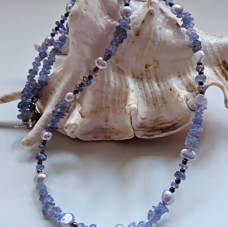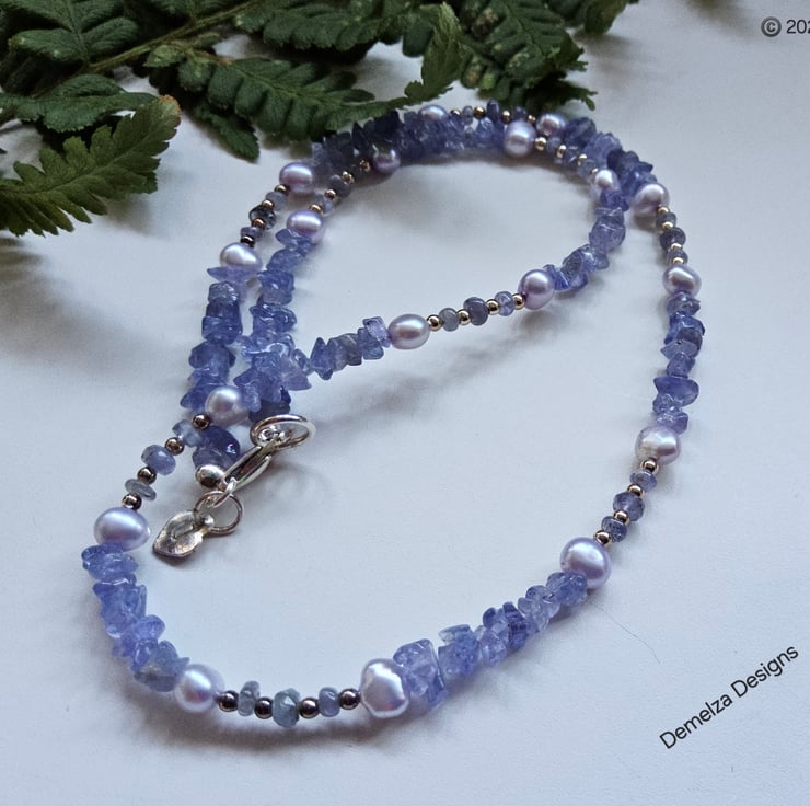 This delicate feminine looking necklace has been designed for those whom like pretty unique quality jewellery to wear for a special occasion or for everyday wear. The AA grade tanzanite small tumble nuggets and A grade faceted roundels have good colour during normal natural daylight, which darkens in it's appearance under candecent lighting due to it's natural triqoick properties. The necklace has soft light siiver blue quality small freshwater pearls to compliment the tanzanite with tiny 925 sterling silver spacer beads for a touch of sparkle.
